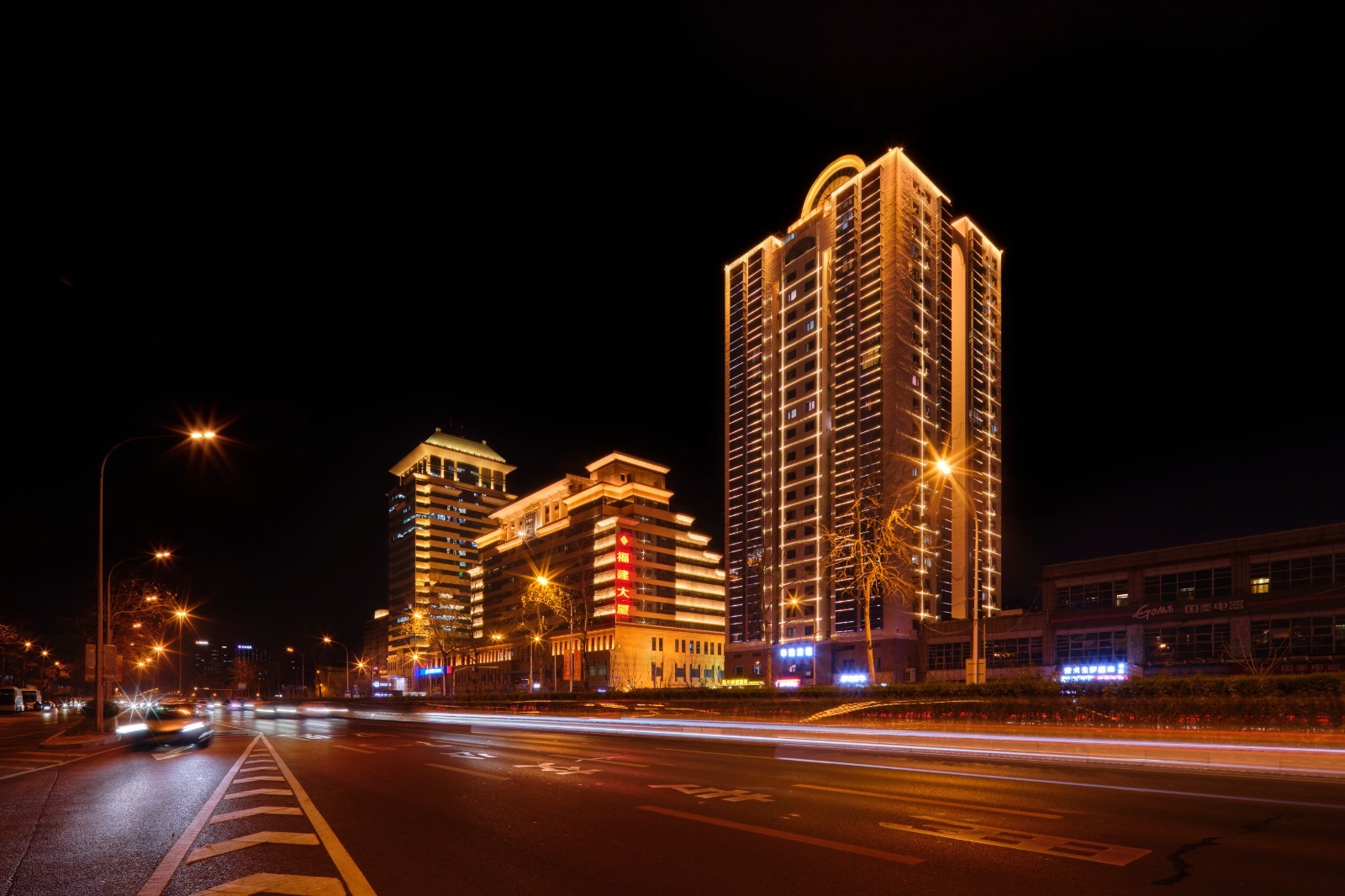 北段(三元桥至安华桥)全长5.6公里,定位为国际商务通廊夜景轴带。沿线120余栋建筑在灯光改造后焕然一新,暖金色光带串联起商圈、社区与交通节点,将市井烟火与商务楼宇的现代感有机融合。灯光设计根据不同建筑功能分类实施:公共建筑突出庄重大气,住宅照明则以柔和温馨的暖光为主,在补足原有照明暗区的同时,塑造出层次分明、动静结合的夜间天际线。