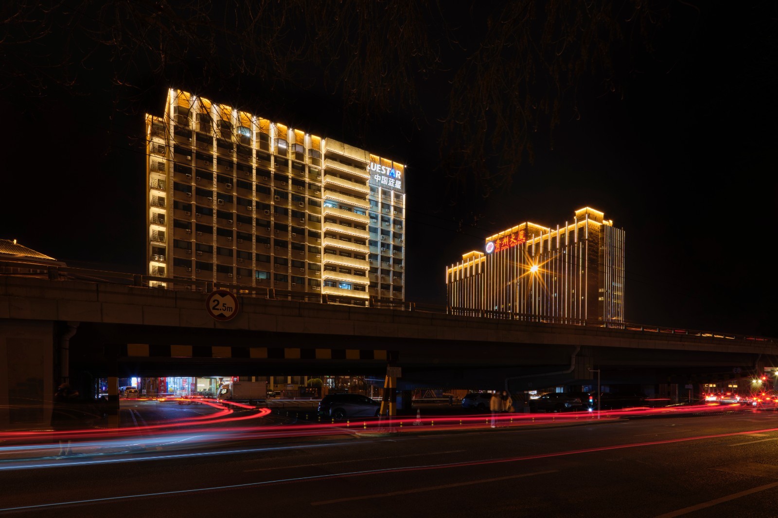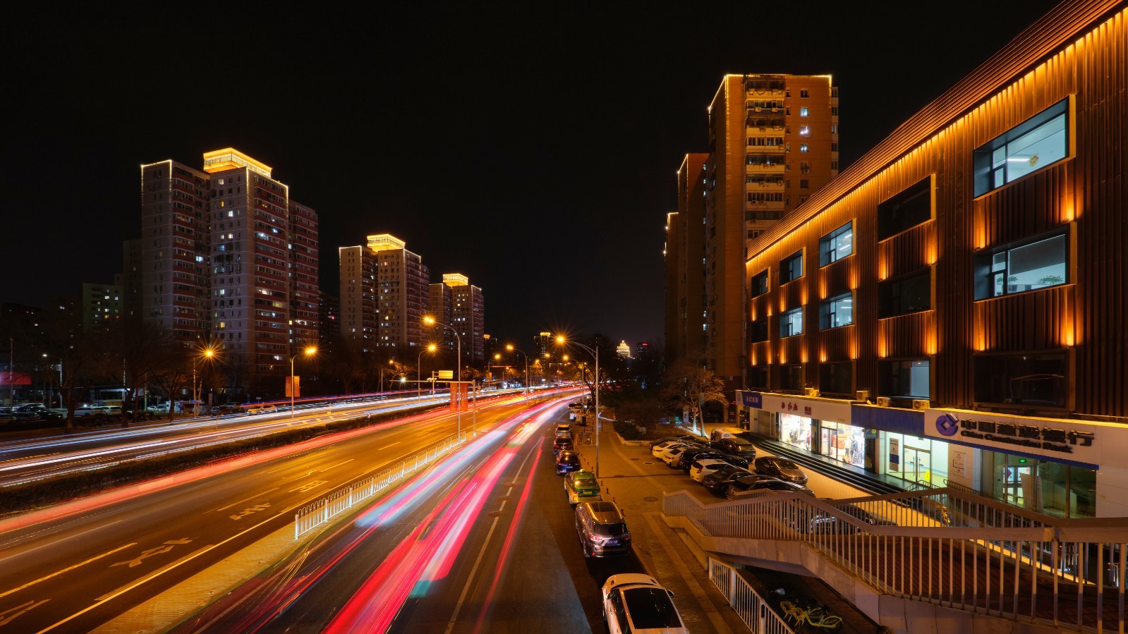 南段(劲松桥至分钟寺桥)全长2.2公里,80余栋建筑实现了从暗区到亮点的提升。暖金色灯光细致勾勒建筑轮廓,既展现商务楼宇的现代气势,更烘托居住社区的生活气息,有效拓展“宜居”夜生活空间,让老旧居民小区焕发活力。更新改造后的照明与劲松桥周边的城市活力、分钟寺桥的交通枢纽功能相互呼应,形成一段连贯而富有温度的夜景走廊。