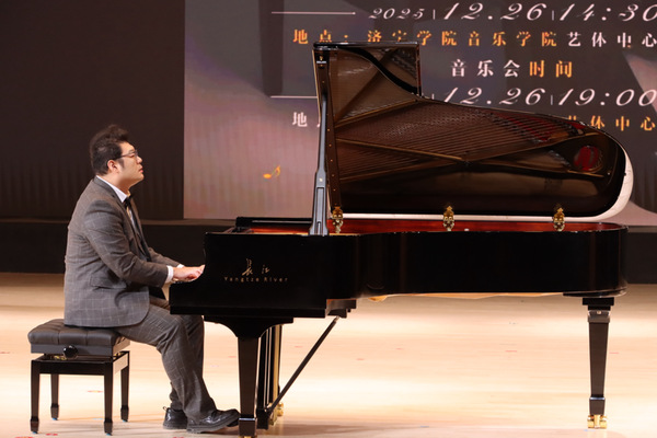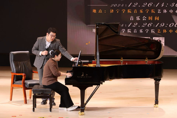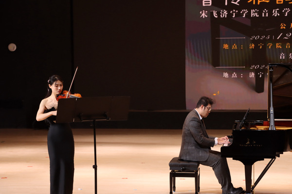 12月26日,济宁学院音乐学院艺体中心内琴声悠扬,一场兼具专业高度与艺术温度的盛宴在此精彩上演。本次活动以“音传雅韵,指尖逐光”为主题,特邀旅欧钢琴家、山东外事职业大学国际钢琴艺术中心主任宋飞教授领衔,与济宁学院音乐学院两位青年教师——俄罗斯小提琴博士刘婧祎、美国钢琴博士张思涵同台献艺,为观众带来了一场精彩的钢琴公开课暨专场演出。本场活动分为14:30钢琴公开课与19:00专场音乐会两个环节。济宁学院音乐学院师生齐聚现场聆听品鉴,乐声悠扬,掌声不绝,为冬日的校园镌刻下浓墨重彩的艺术印记。