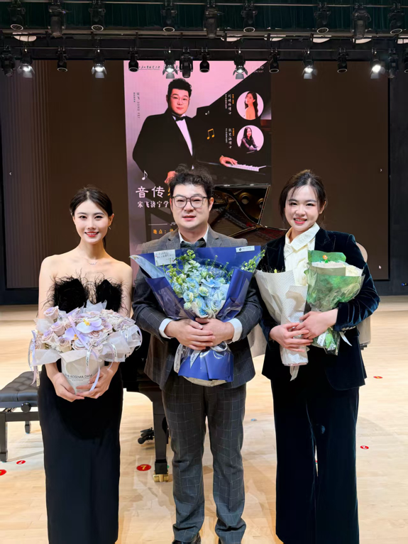如果说上半场的西方经典让观众沉醉于古典音乐的魅力,下半场的民族经典则让在场听众感受到中国钢琴作品的磅礴底蕴与家国情怀,奏响了本场音乐会的最强音。宋飞携手美国钢琴博士张思涵,以双钢琴形式联袂演绎经典之作《黄河》钢琴协奏曲,这首由殷承宗等大师改编自《黄河大合唱》的传世佳作,是中国钢琴艺术的里程碑式作品。从《黄河船夫曲》的雄浑激荡,到《黄河颂》的深情豪迈,再到《黄河愤》的悲愤激昂,终至《保卫黄河》的铿锵雄壮,双钢琴的完美协奏,将黄河的奔腾气势、中华儿女的家国情怀与民族气节展现得淋漓尽致,恢弘的旋律响彻全场,直击人心,让在场每一位听众都感受到中国音乐的磅礴力量与艺术魅力。音乐会最后,宋飞以刘诗昆先生改编的经典曲目《我的祖国》收尾,熟悉的旋律温润悠扬饱含着对祖国的深情眷恋,真挚的情感流淌在每一个音符里,为整场音乐会画上圆满而温暖的句号。
