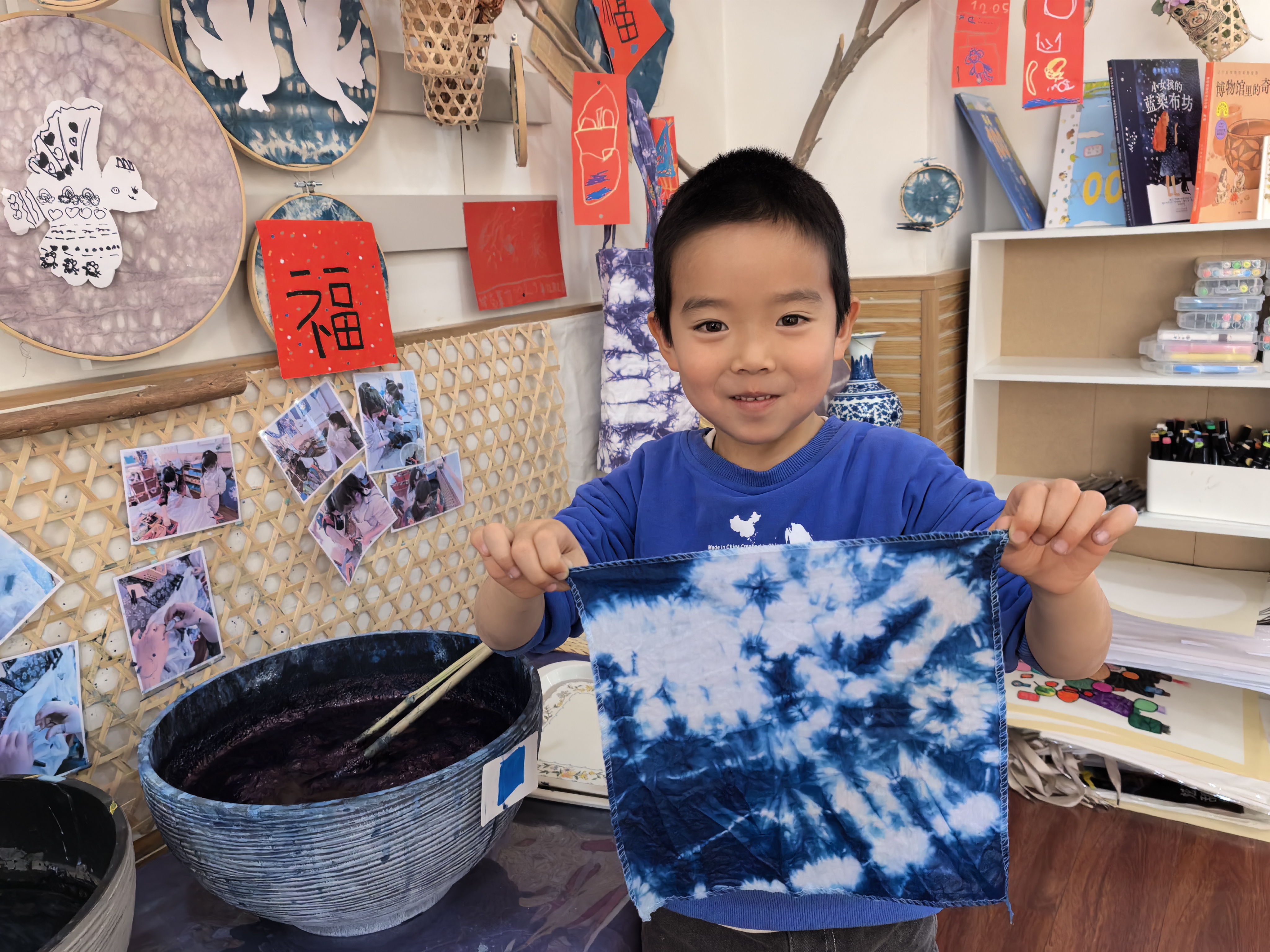 活动中,孩子们的身影穿梭其间,脸上洋溢着好奇与兴奋。扎染台前,孩子们折叠、捆绑、浸染,朴素白布绽放出独一无二的花纹;版画区里,幼儿手握工具拓印出充满童趣的民俗作品;剪纸区域内,红纸翻飞间,吉祥纹样、生肖图案与窗花逐渐成型,每一件作品都饱含童真与心意。