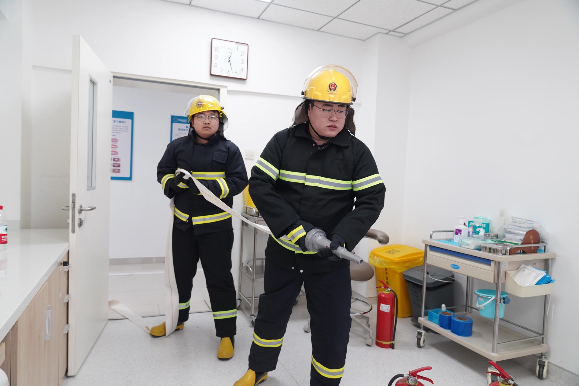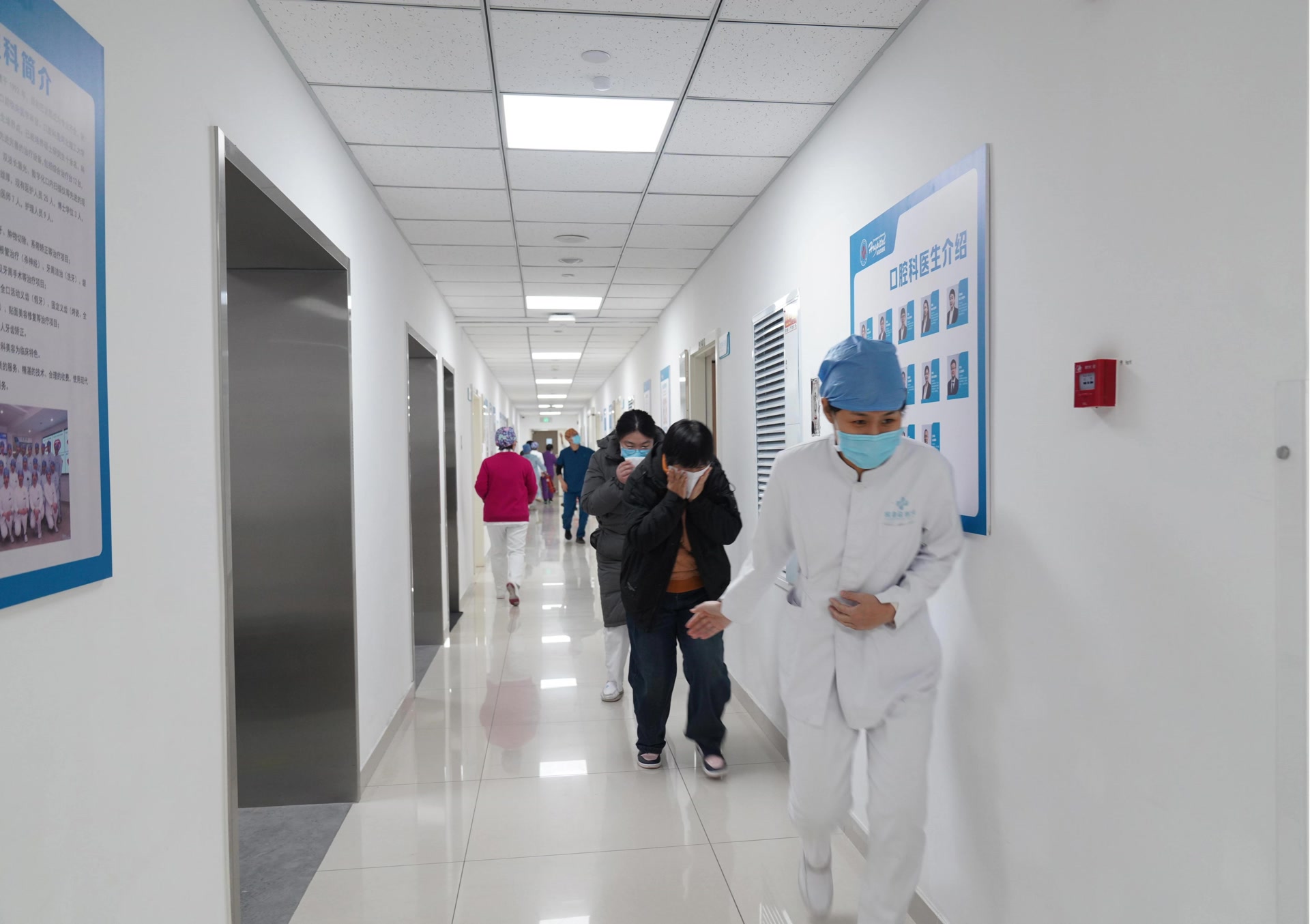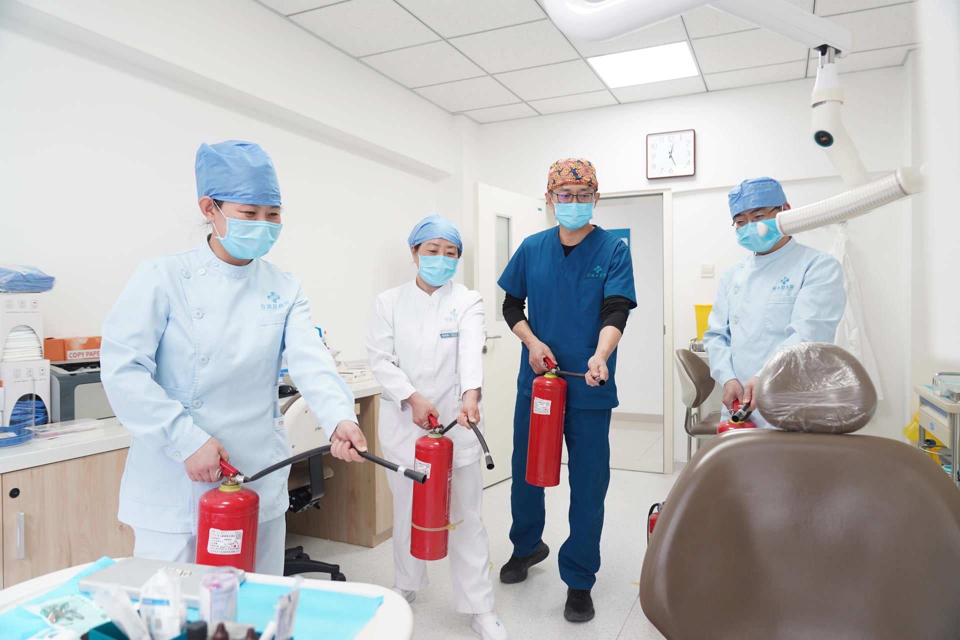 演练模拟口腔诊室发生初期火情。医护人员沉着冷静,在第一时间通过手动报警装置和内部通讯系统同步报警,准确说明火情位置与现场情况。警报响起后,科室人员迅速转为疏散引导员,组织“患者”及家属用湿毛巾掩住口鼻,低姿态沿安全通道有序、快速撤离,并对行动不便人员予以重点帮扶,确保全员安全转移至集结点。与此同时,科室负责人严格贯彻“1分钟灭火”原则,现场指挥开展初期火灾扑救。