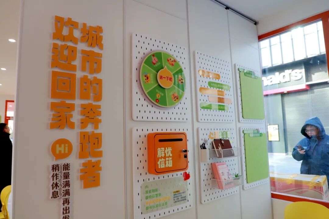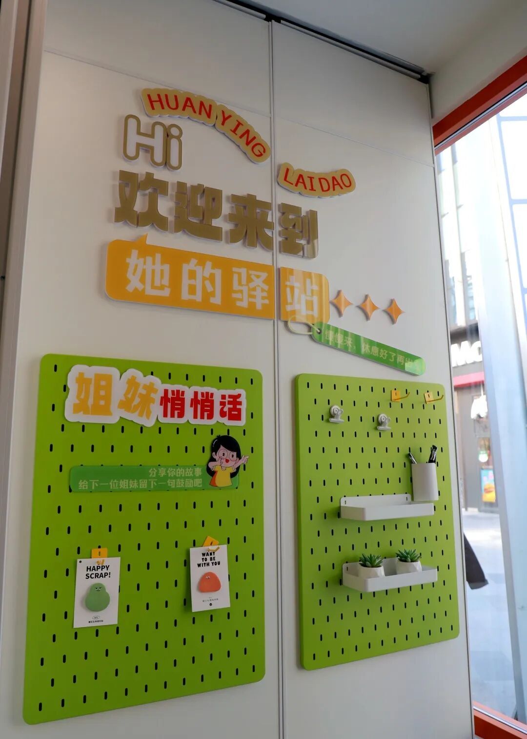 驿站不仅配备了桌椅、微波炉、饮水机、空调等基础设施,还配有医药箱、充电器、雨伞等常用物资,并为女性新就业群体设置专属空间,每人每天还可以领取一次“能量补给”,让温暖与服务真正融入新就业群体的日常奔波。