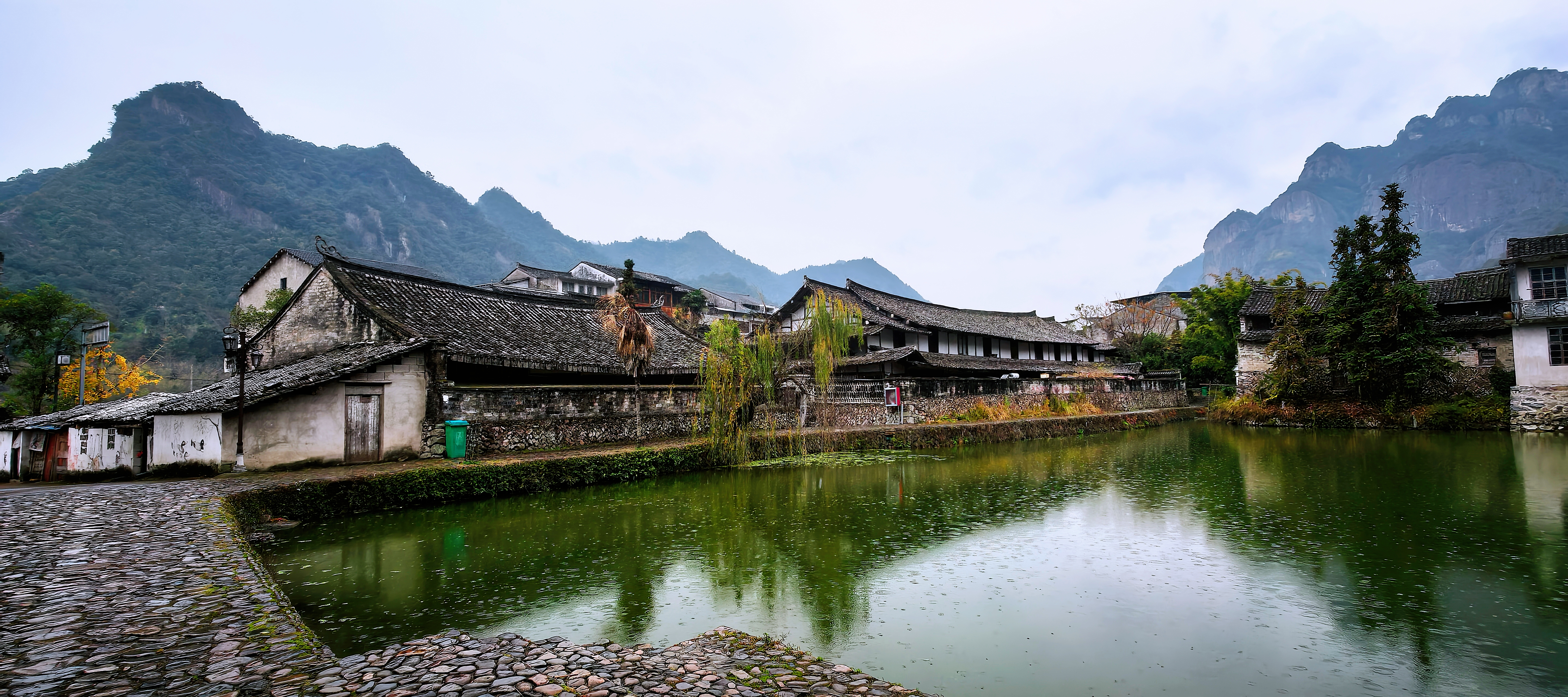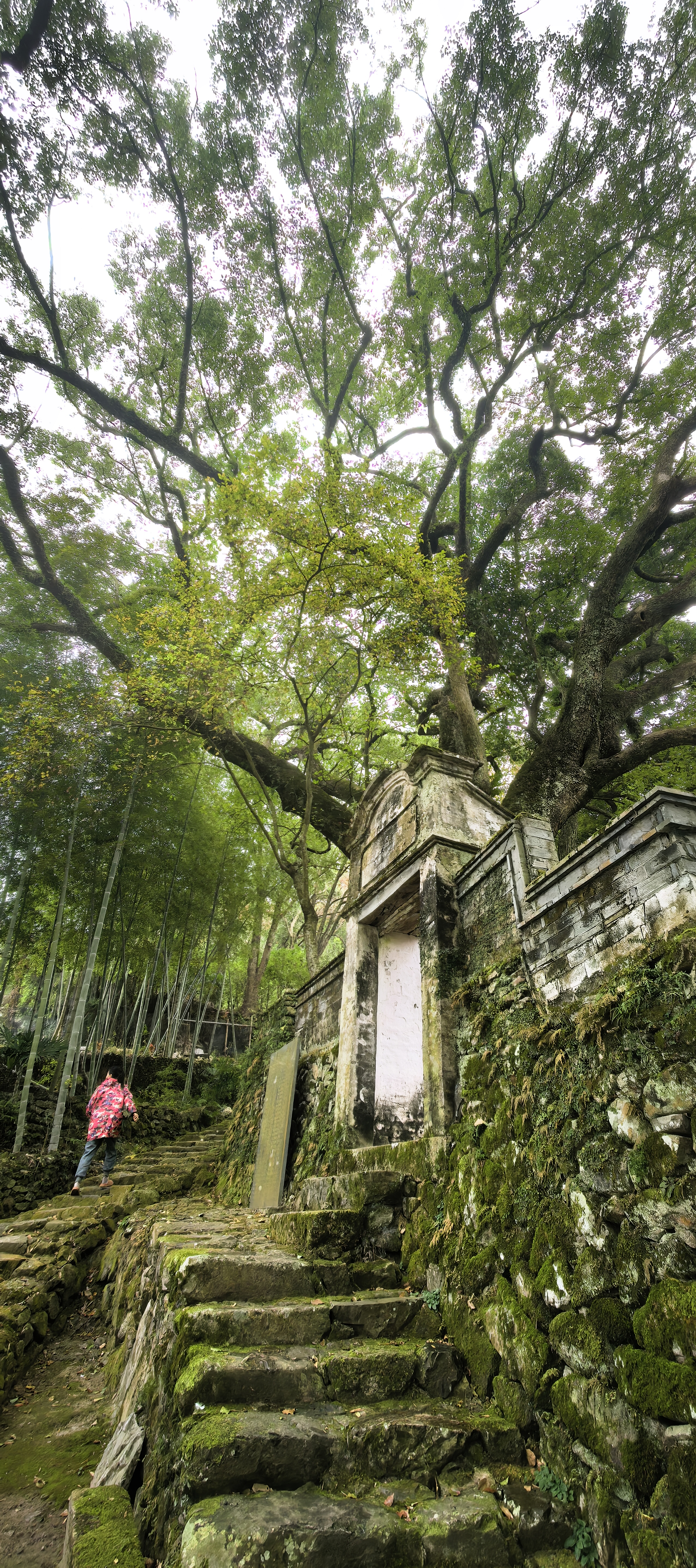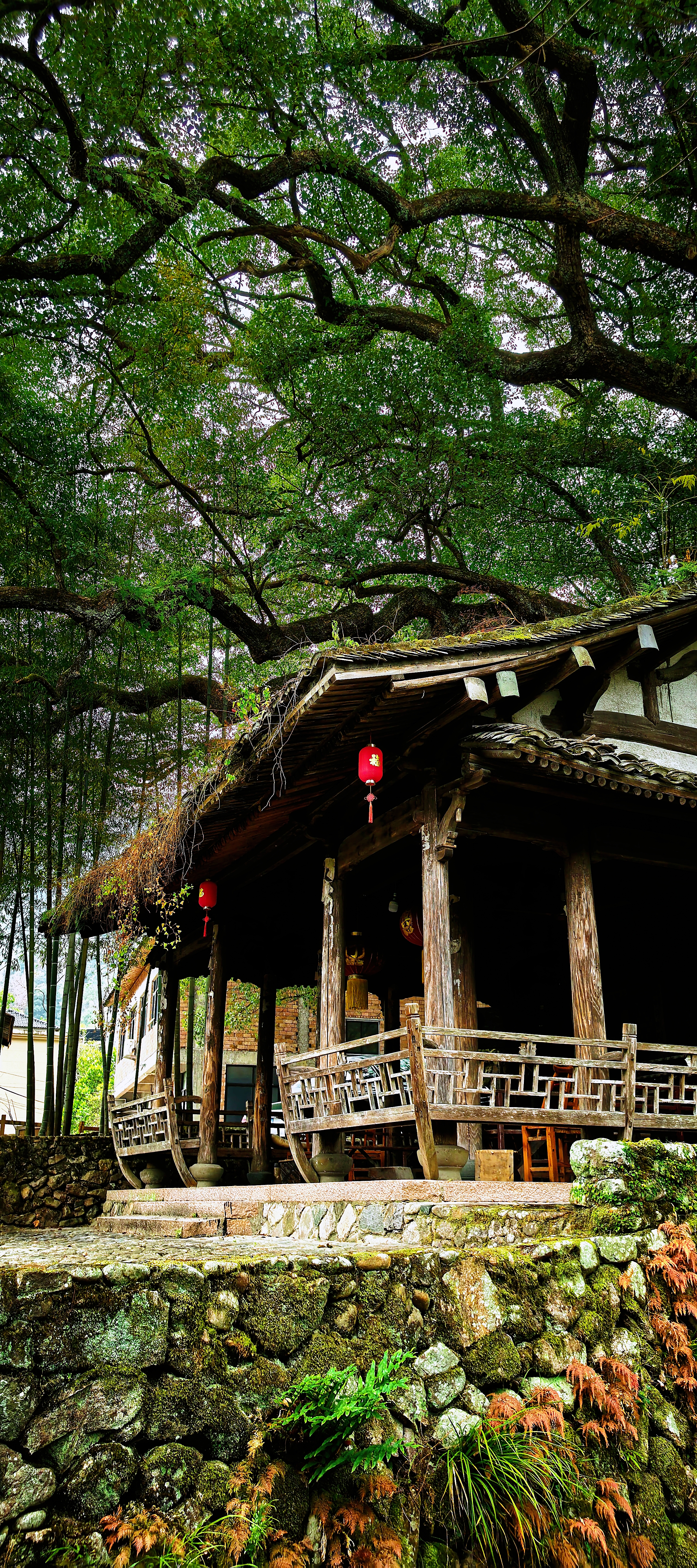 雨中的山村静谧人稀,沿小路而上,不知不觉中走到卧龙岗,卧龙岗在祖山山腰,两棵500多年的古榕树遮天蔽日,山顶的翠竹高大挺拔。站在岗顶的人工平台举目四望,整个古村尽收眼底。村落地形如船,背倚丹崖如染的九螺山,面朝苍翠挺秀的梧山,依山而建的屋舍错落有致。