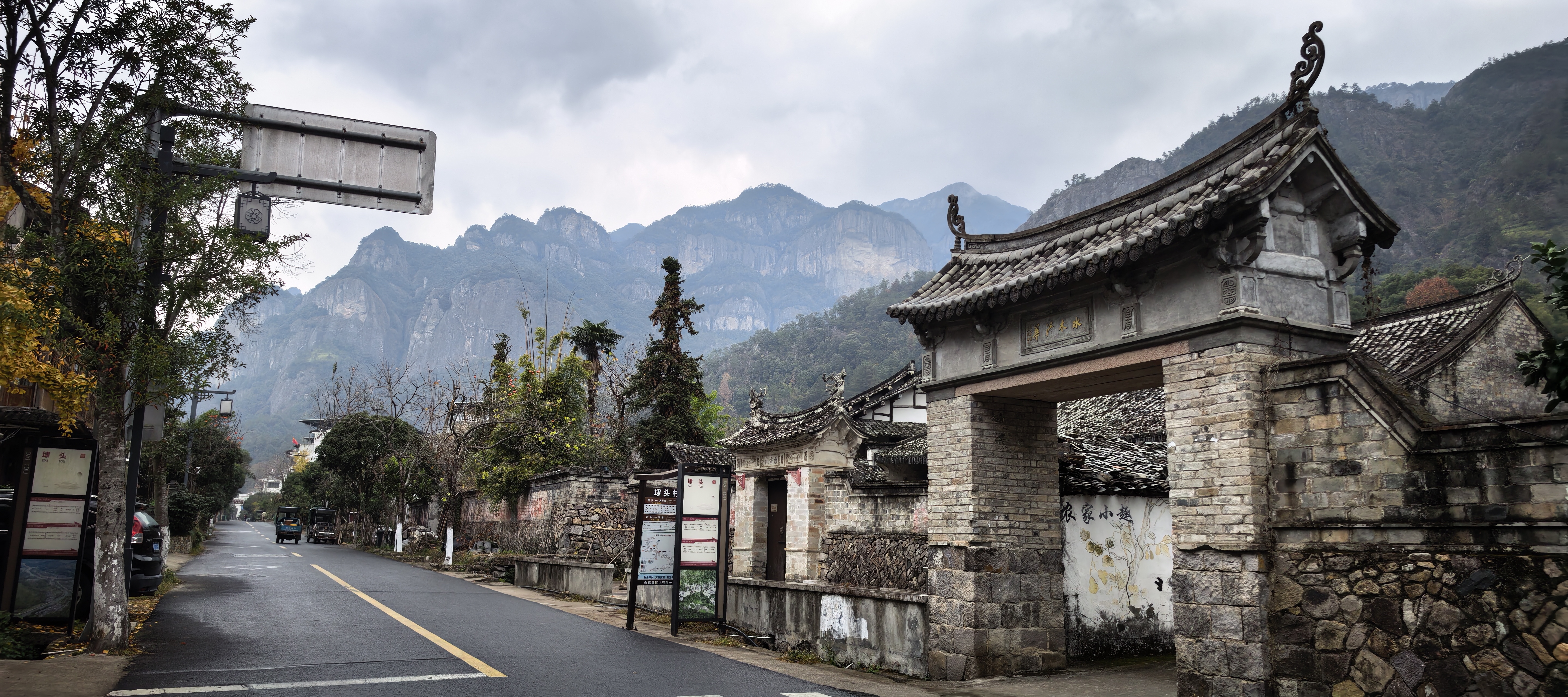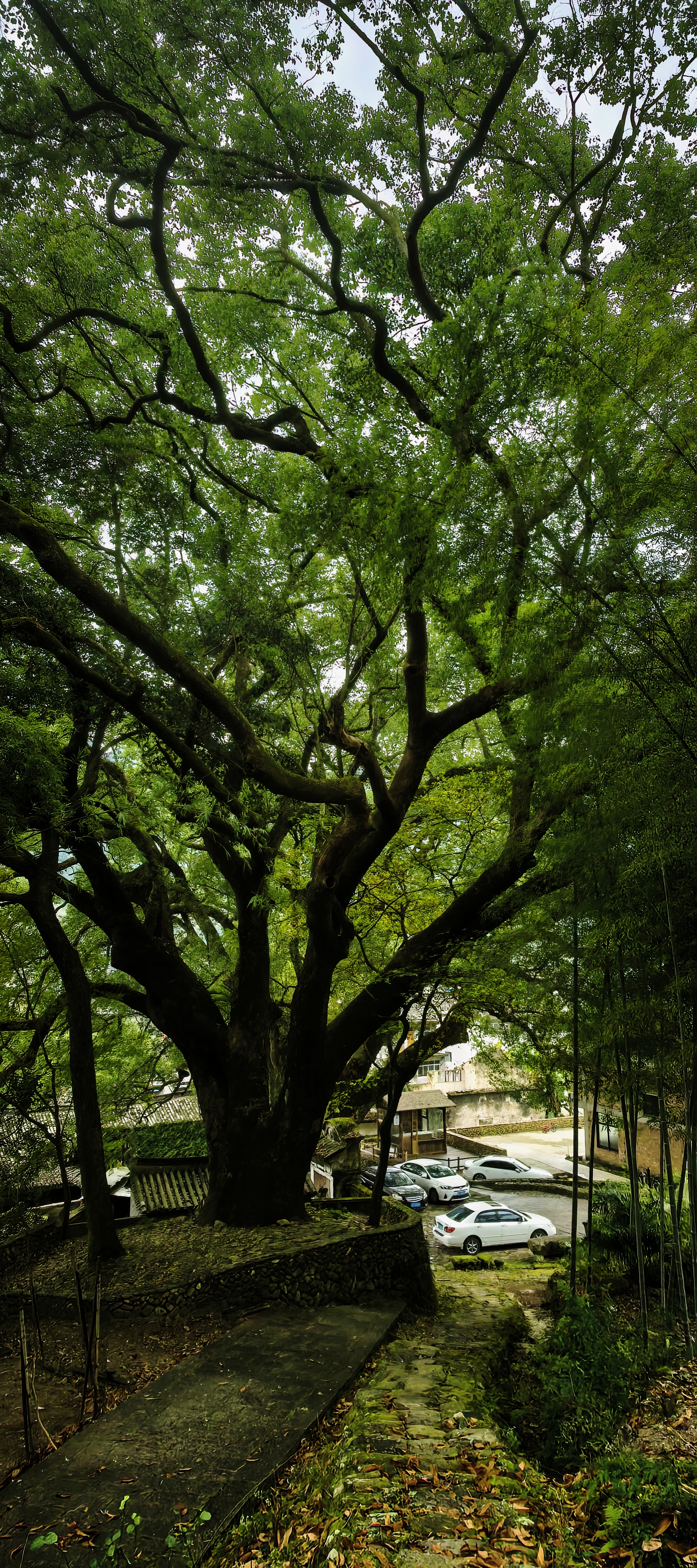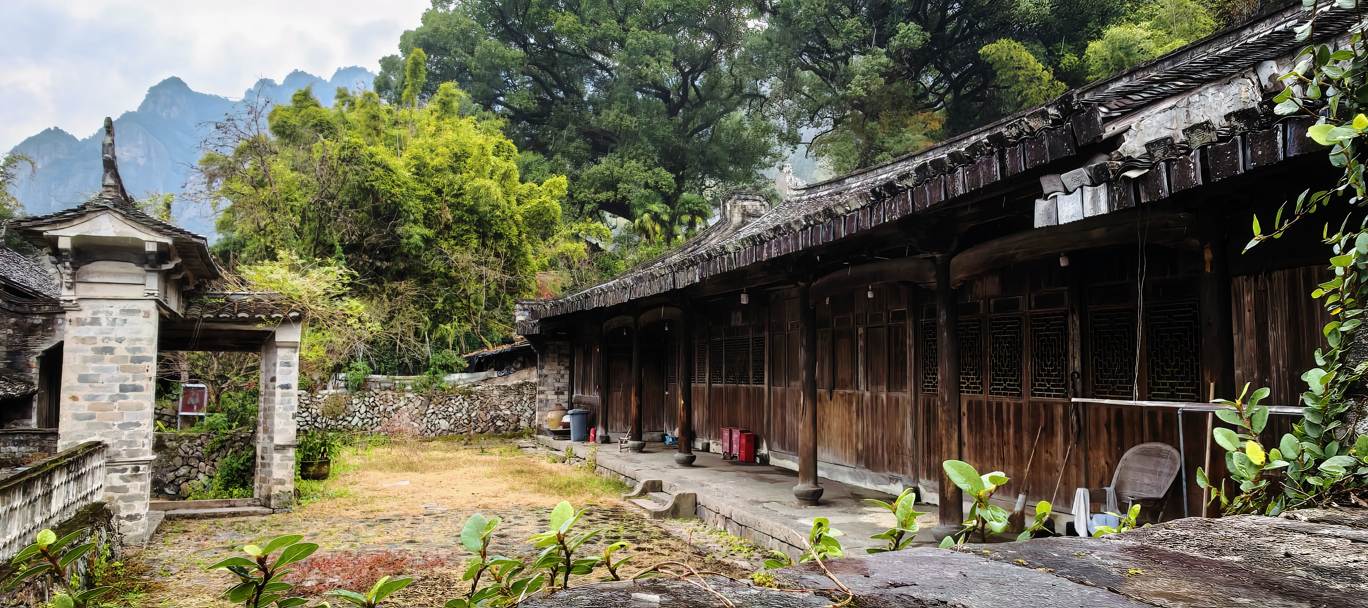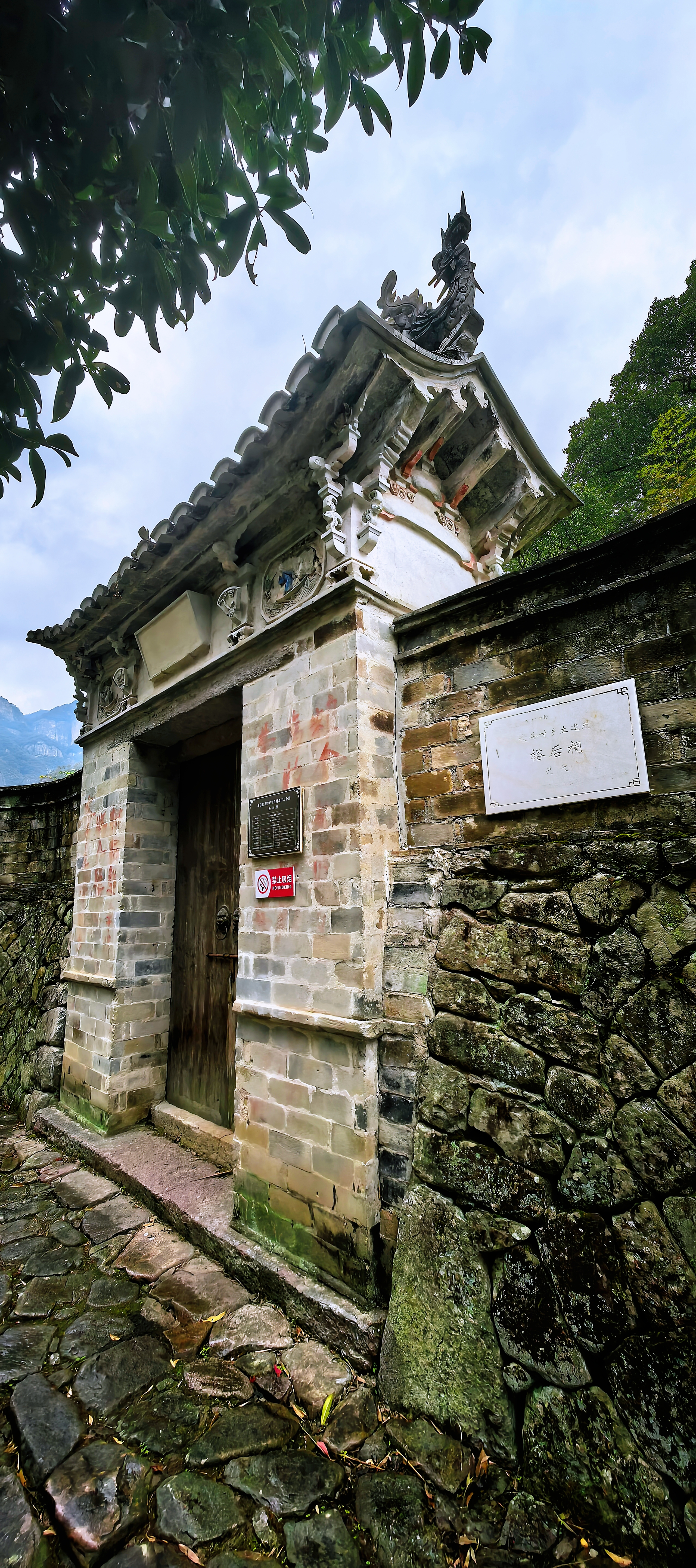 雨中的山村静谧人稀,沿小路而上,不知不觉中走到卧龙岗,卧龙岗在祖山山腰,两棵500多年的古榕树遮天蔽日,山顶的翠竹高大挺拔。站在岗顶的人工平台举目四望,整个古村尽收眼底。村落地形如船,背倚丹崖如染的九螺山,面朝苍翠挺秀的梧山,依山而建的屋舍错落有致。