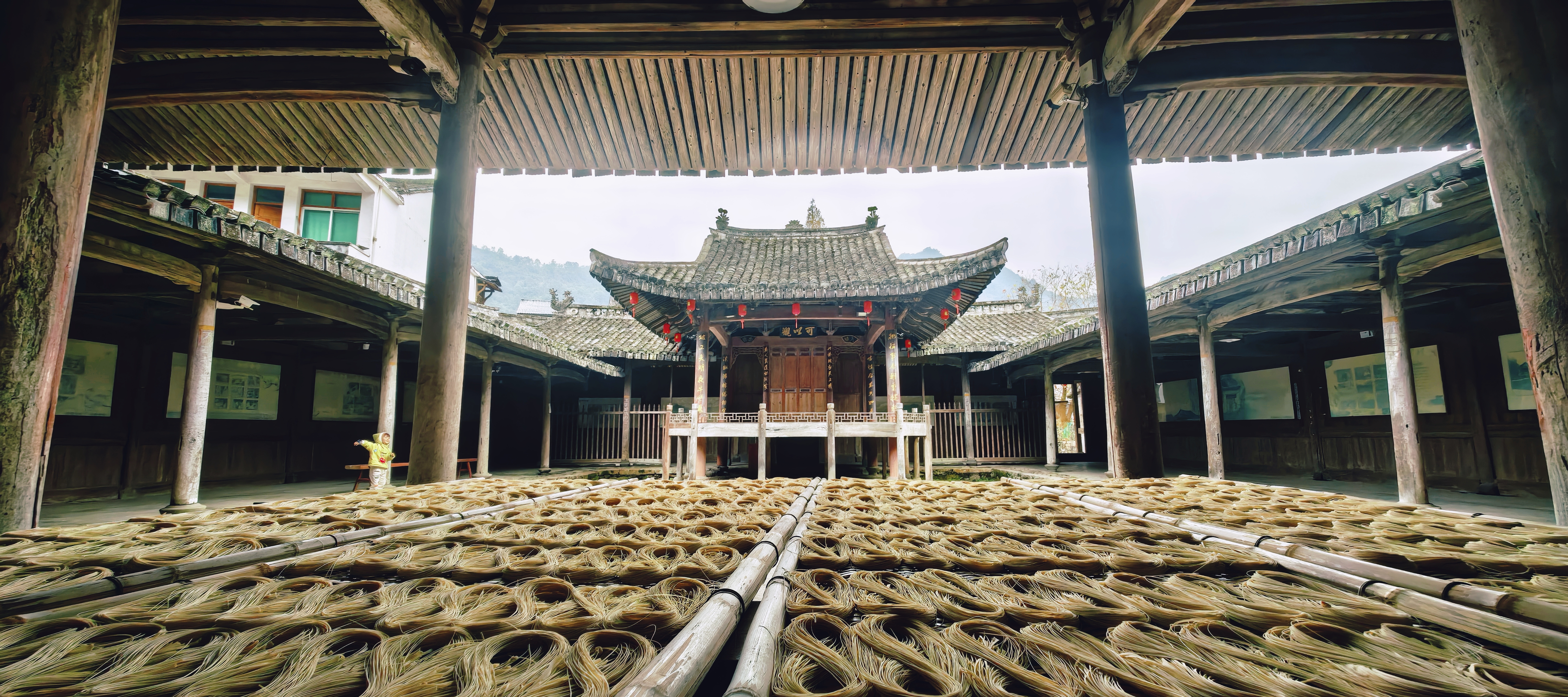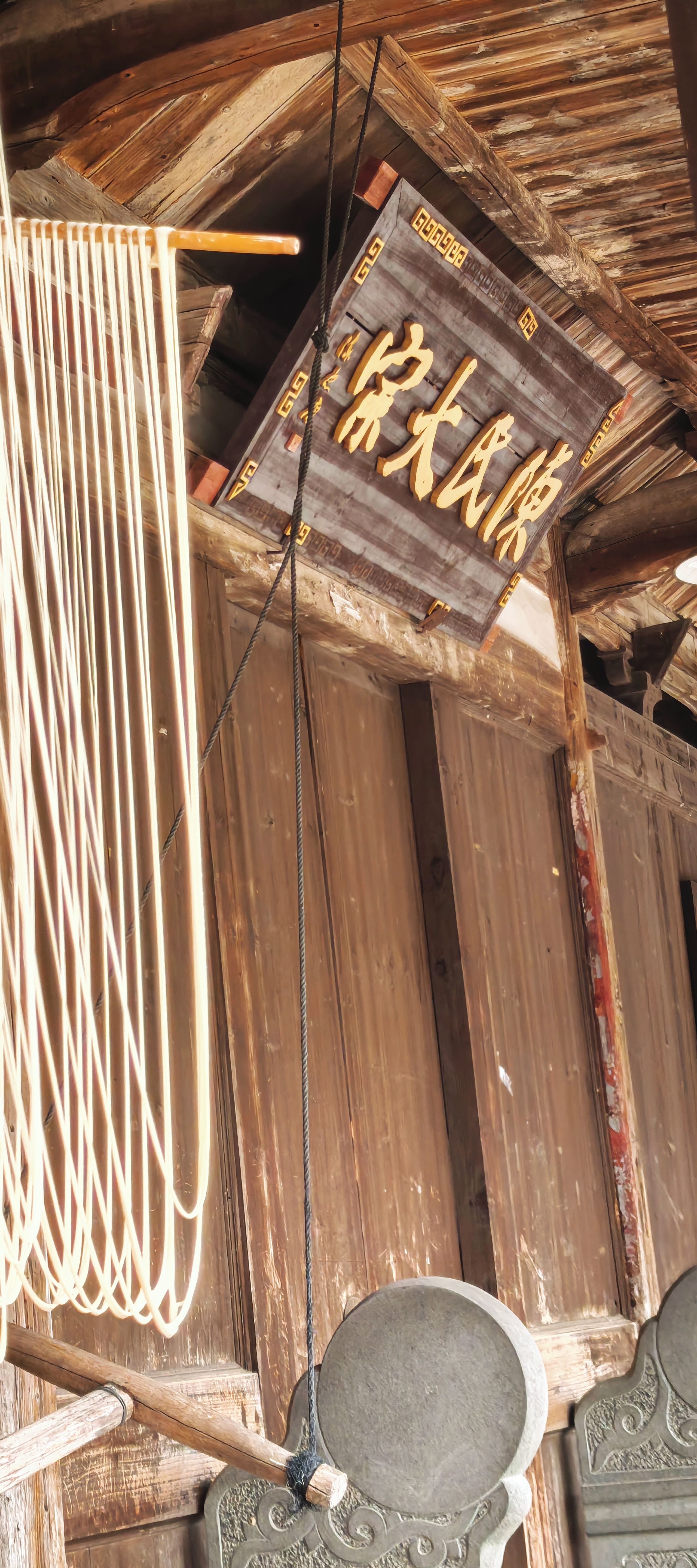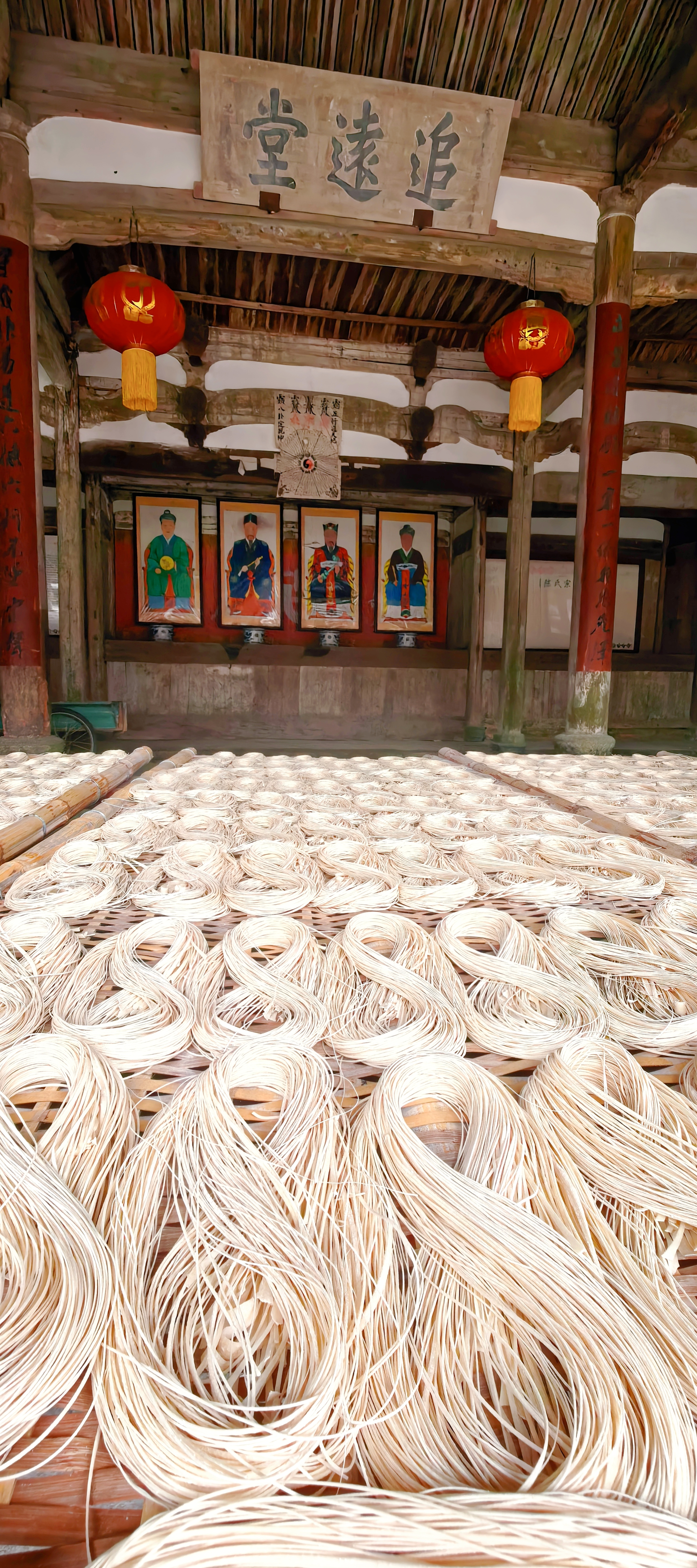 为了避雨我们躲进入陈氏大宗祠,此时,只见竹竿搭就的架上,细如银丝的挂面垂挂舒展,面香混着雨润的泥土气息漫开。雨水则顺着瓦当滴落,砸在青石板上,溅起一圈圈小小的水花,叮咚作响,像是古村在低声诉说着千百年的故事。