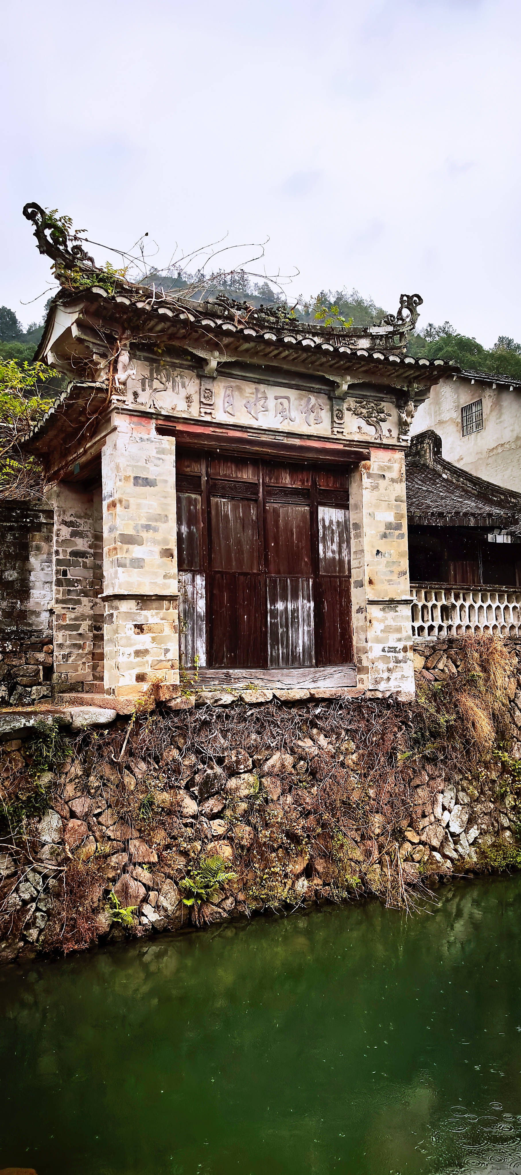 拐过一道窄巷,又见一池塘,池水清澈见底,倒映着岸边的古屋和垂柳,雨打在竹叶上,簌簌作响,池塘对岸一座“松风水月”的砖门格外醒目。小院院门紧闭,隔墙眺望,院内宽大整洁,厢房木窗半开,老墙与墨瓦被雨水洗得愈发清晰。