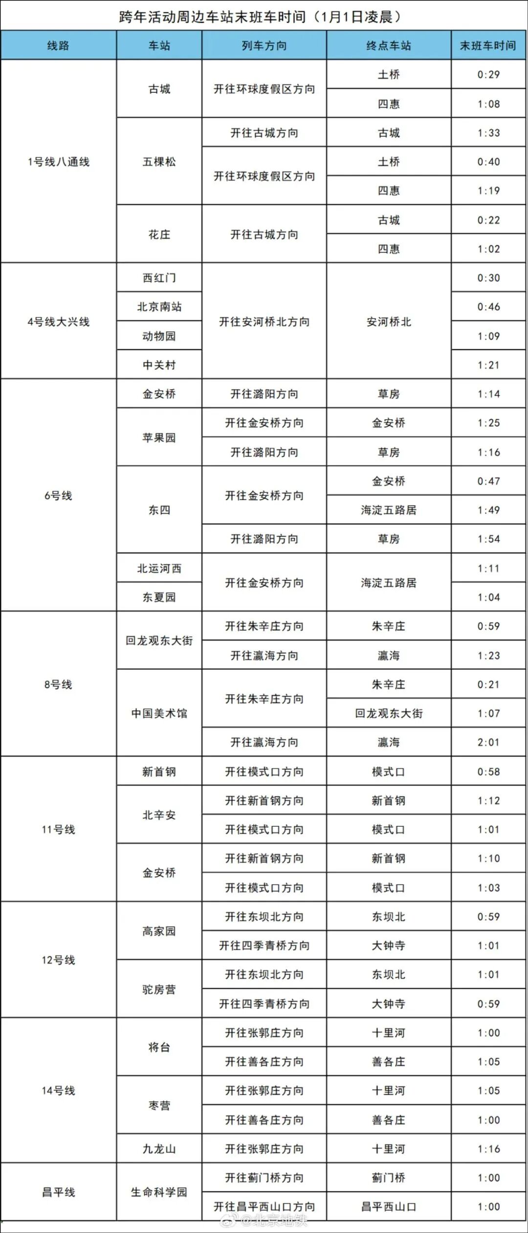 为保障跨年活动安全顺利,2025年12月31日地铁1号线八通线、4号线大兴线、6号线、8号线、11号线、12号线、14号线、昌平线部分区段延时运营,具体运营信息如下: