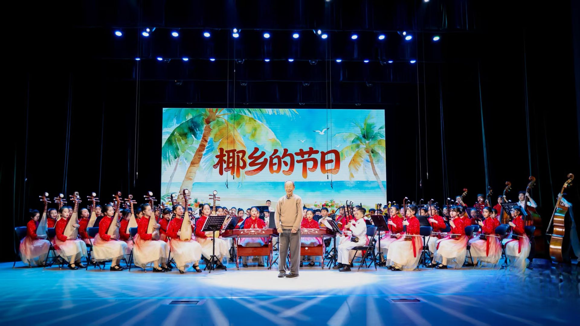 音乐会现场,两校乐团轮番登台、各展风采。万泉小学金帆民乐团率先奏响《龙腾虎跃》,拉开演出序幕,随后演绎了灵动婉转的《塔吉克舞曲》、欢快明朗的《椰乡的节日》等经典曲目,在指挥家的专业引领下,尽显民族管弦乐的独特魅力。特别值得一提的是,88岁高龄的著名音乐教育家、作曲家王志伟先生亲临现场,亲自指挥自己的原创作品《椰乡的节日》,并分享了与两校的深厚渊源,对民族音乐传承寄予殷切期望。真挚话语赢得全场热烈掌声。