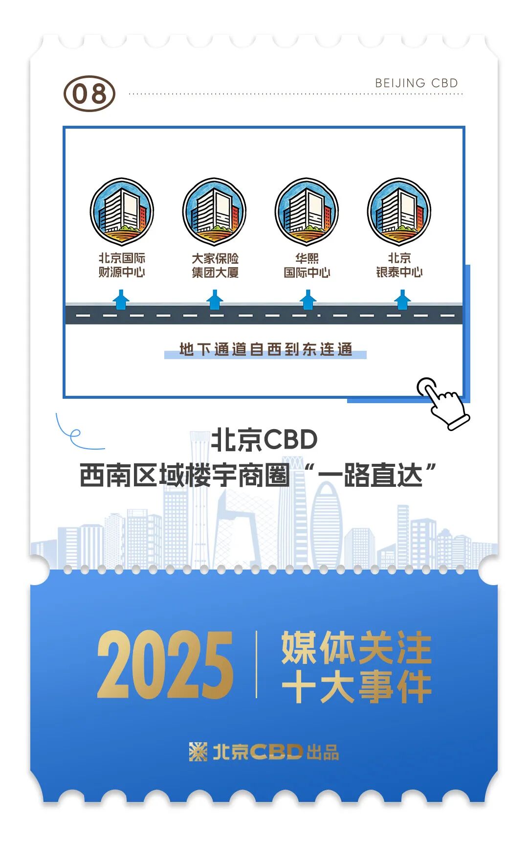 4月,北京国际财源中心至北京银泰中心地下通道实现全线贯通。通道自西到东依次串联起北京国际财源中心、大家保险集团大厦、华熙国际中心、北京银泰中心等写字楼和商圈,与轨道交通1号线、10号线国贸站连通,为CBD西南区域楼宇搭建起便捷的产业合作和联动桥梁,实现西南区域商圈“一路直达”。