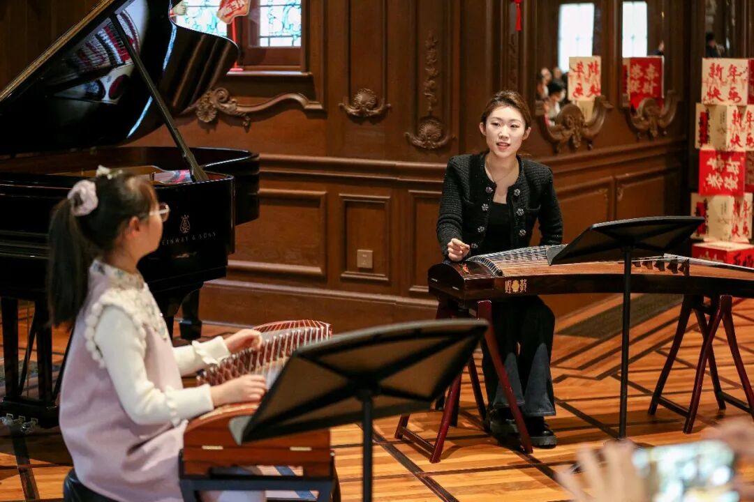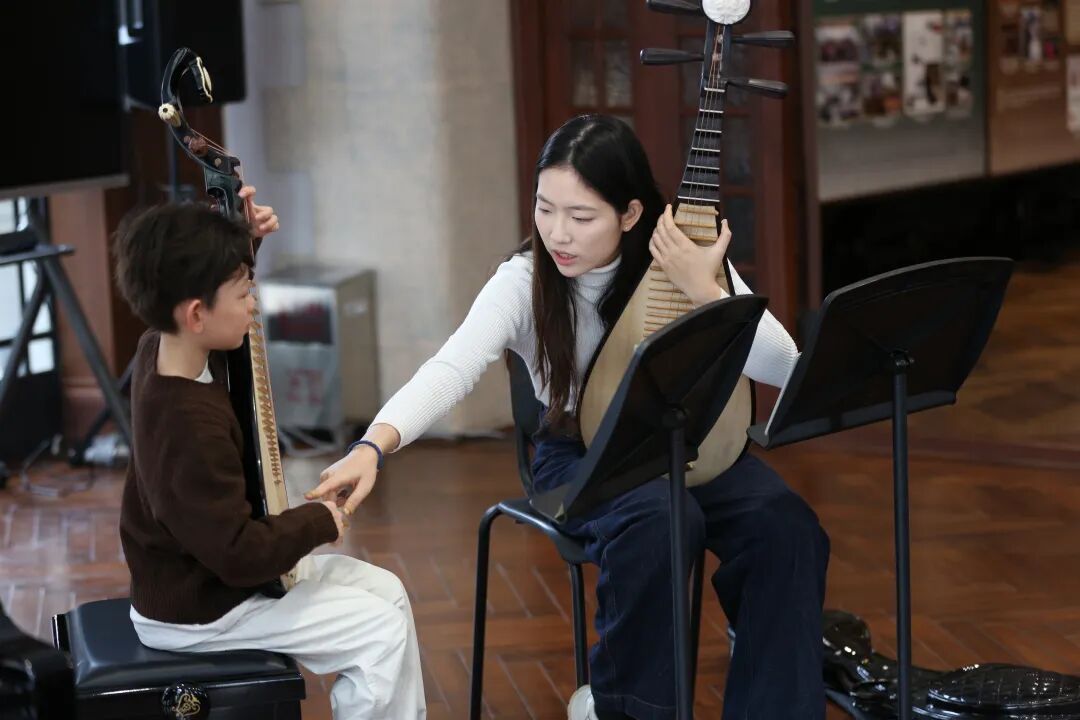在城市音乐会客厅镜厅内,来自上音钢琴系、民乐系、音乐教育系的学生志愿者李佩雯、王熙然、邝越、魏菁源、王喆、陈俊珲,先后指导12名中小学生演奏基础曲目。这场“开放式音乐课堂”吸引了不少家长和市民围观。