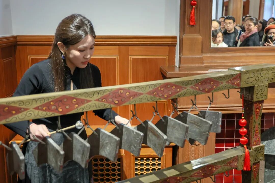新展揭幕活动上,东方乐器博物馆联合上音音乐人工智能实验室,携手上海天文馆,以陨石制成的编磬奏响“天外来客”与中华礼乐的千年和鸣;用AI赋能民族之音,推出“华夏·器韵·声境”智能交互装置;与数字媒体艺术学院联动打造多媒体音画作品《百鸟朝凤》,与音乐街区共同奏响华夏之音。
