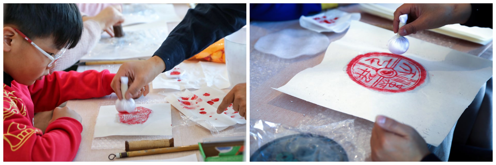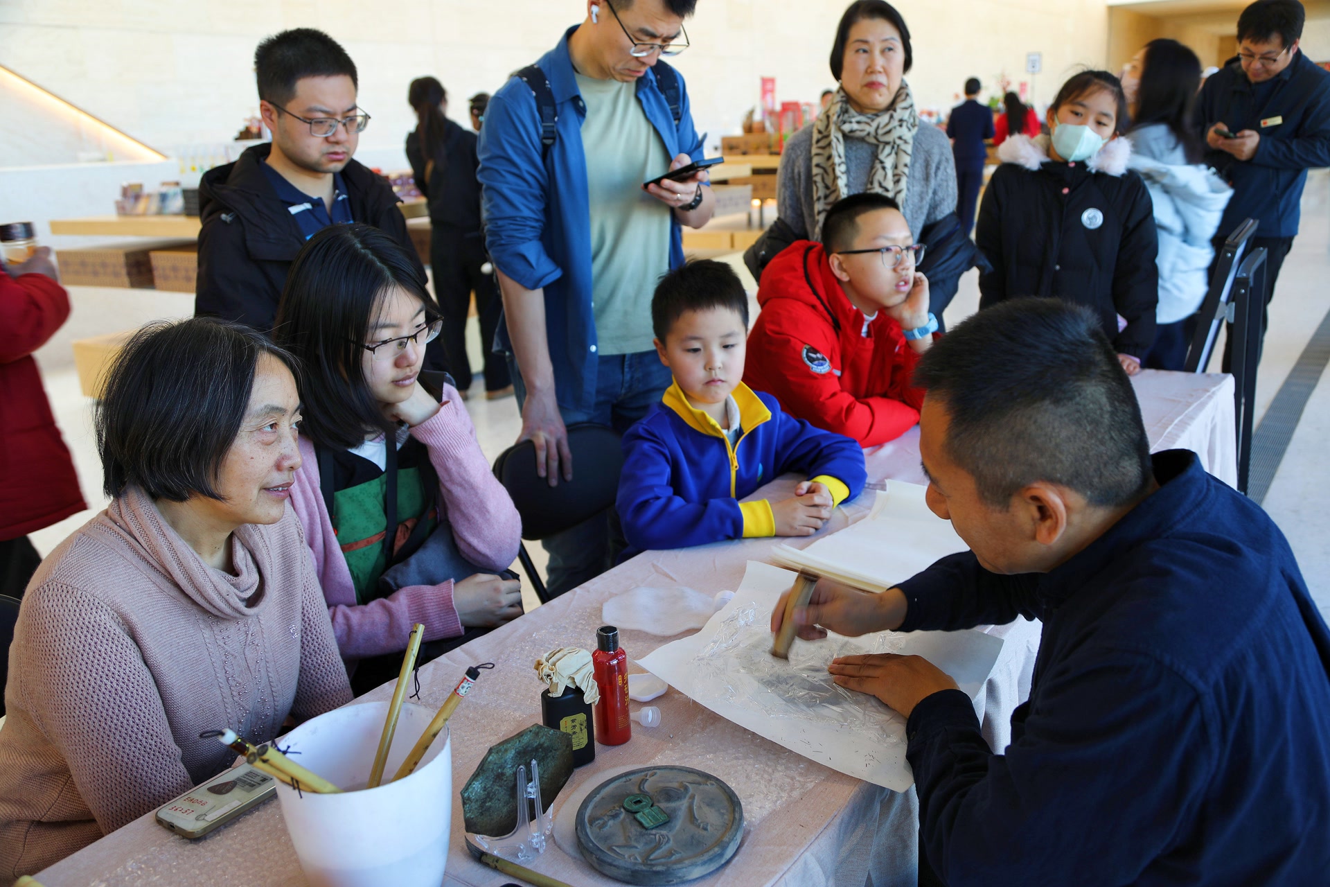 “墨韵传古”拓印活动现场非遗传承人耐心指导大家握拓包、涂墨、覆纸、按压,一步步操作下来,原本空白的宣纸就印上了精美的汉代纹样。