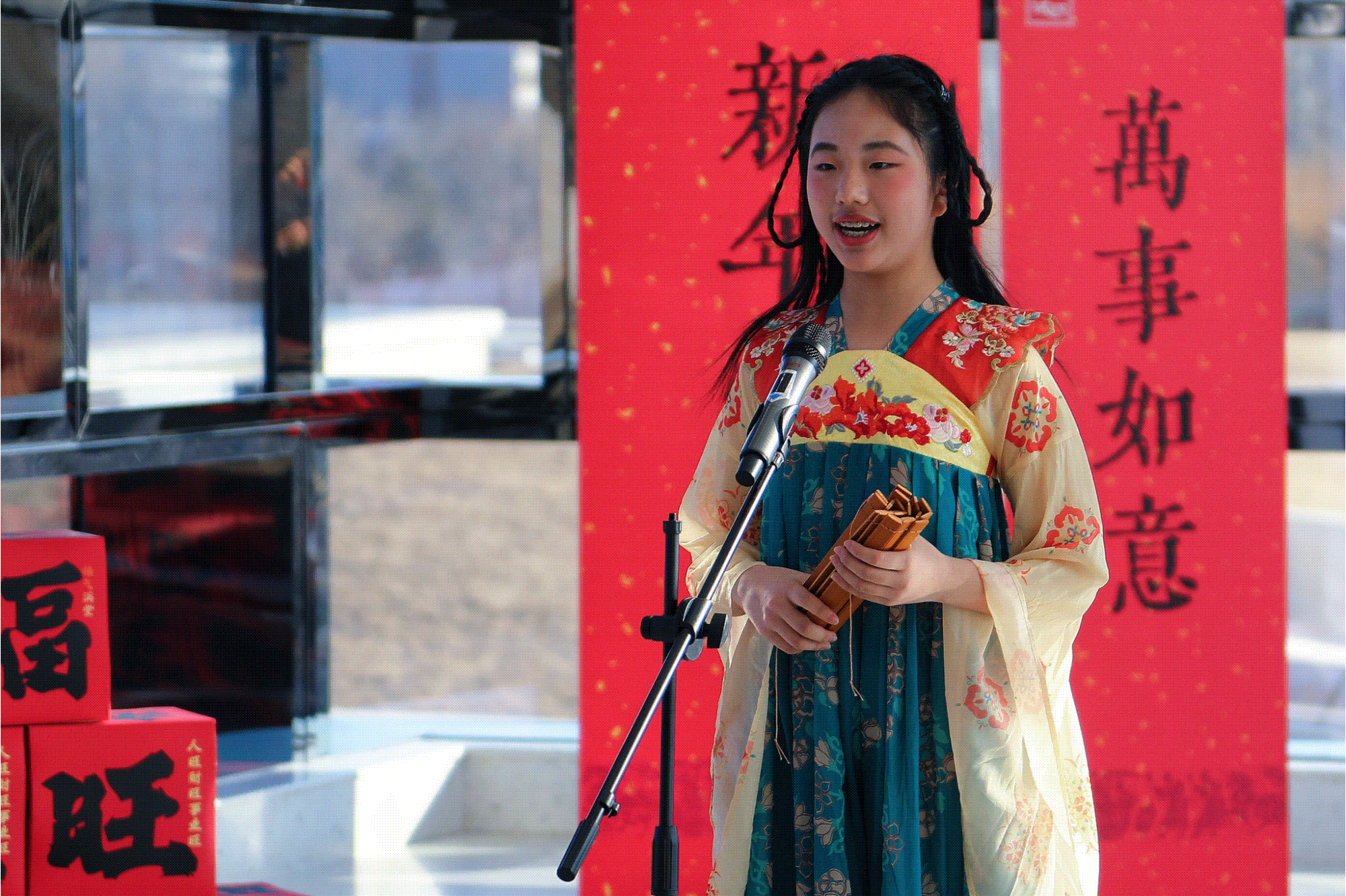 博物馆刚开放,就被前来参与活动的市民挤满!“传承之声”路县少年说志愿者迎新朗诵活动准时开启,身着精致汉服的青少年志愿者们精神抖擞,诵读《诗词谱中华》将中华文化的魅力传递给在场每一个人。