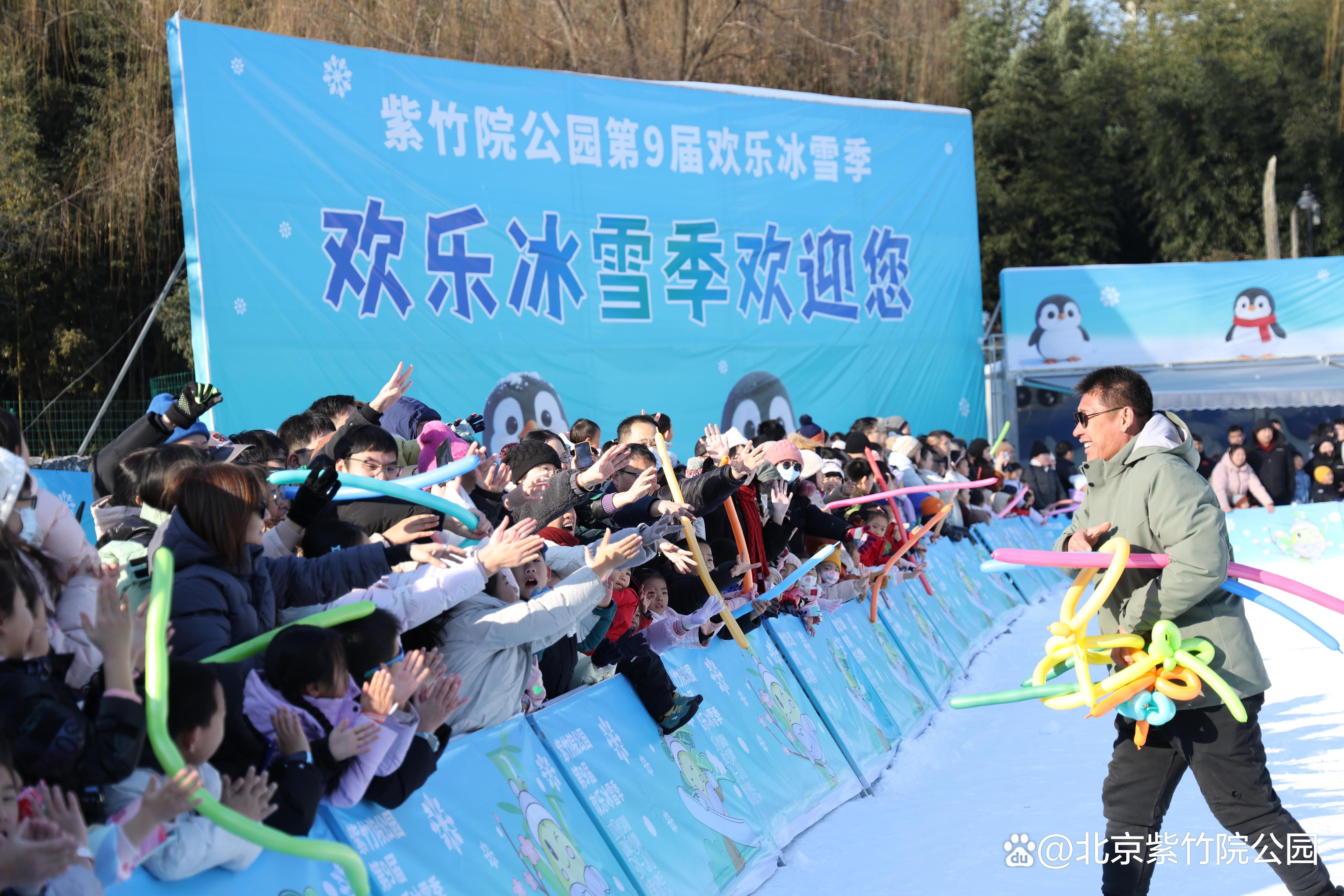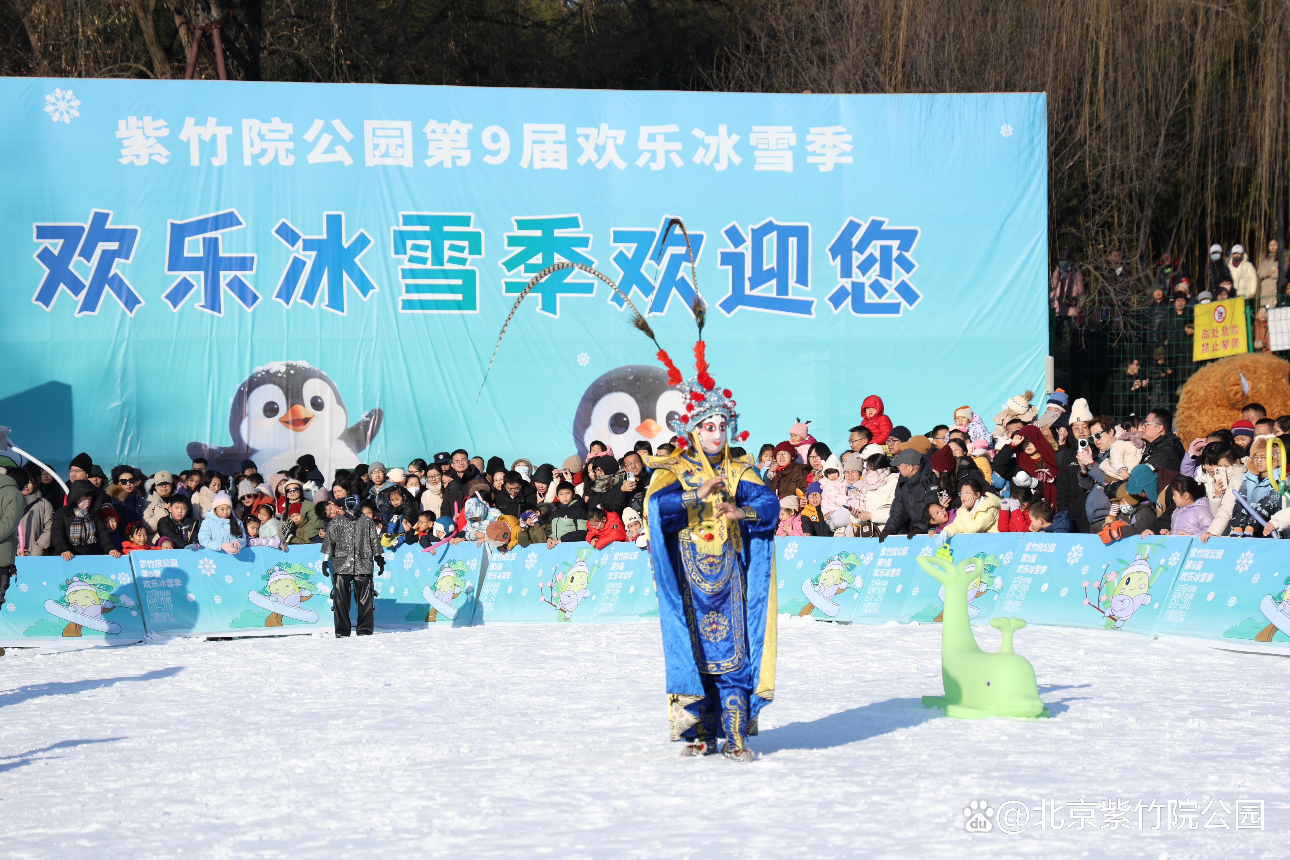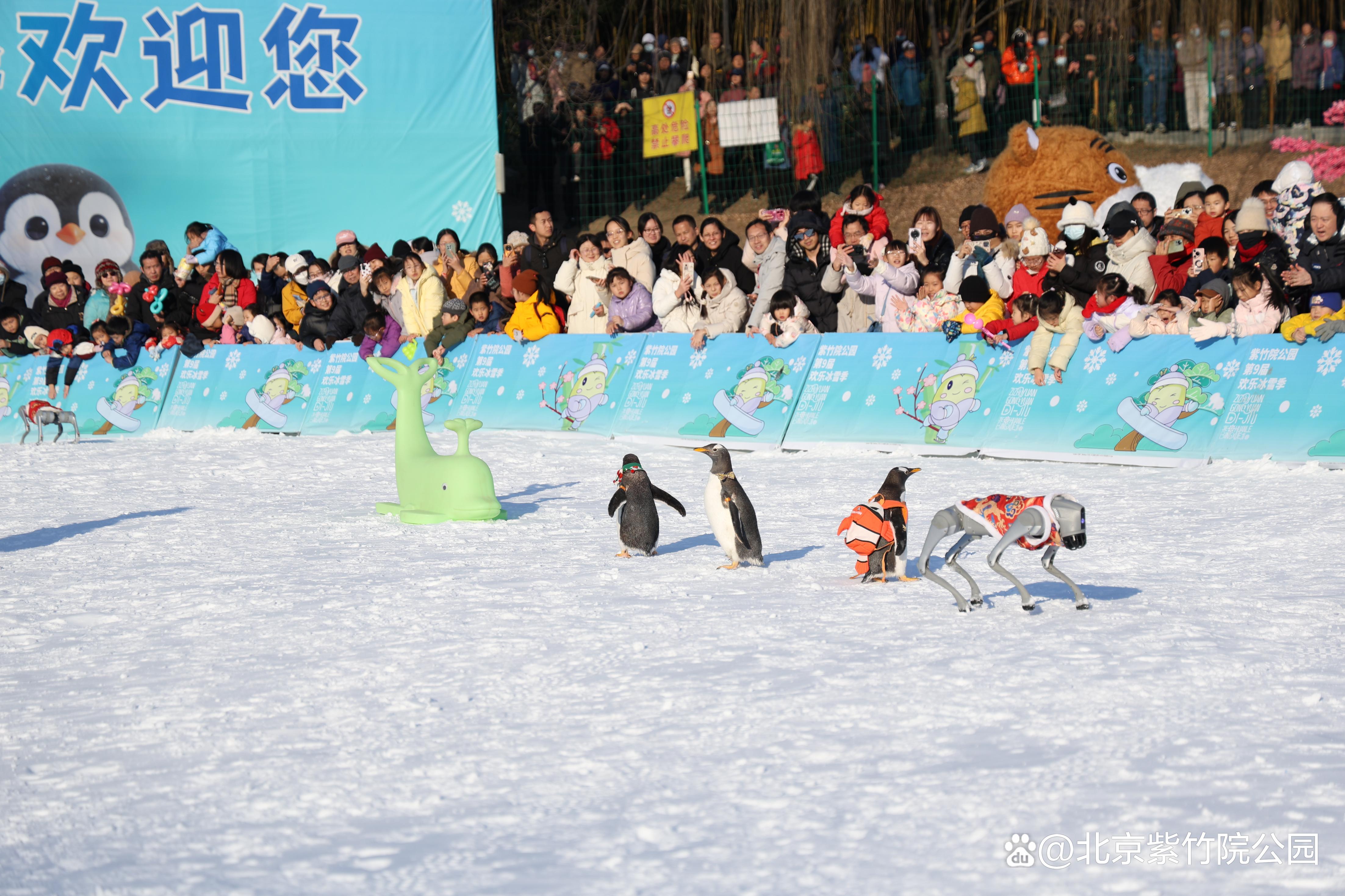 在紫竹院公园雪场,智能机器狗与互动机器人和可爱的企鹅队伍共同巡游,献上精彩舞蹈及互动表演。游客可近距离接触这些“科技萌宠”,感受科技与冰雪碰撞的新奇体验,成为年轻群体与亲子家庭的新晋打卡热点。文化演艺氛围浓厚,特邀专业表演团队在元旦假期定时呈现川剧变脸、奇幻魔术秀等精彩演出,伴随小丑艺人在雪地中穿梭与游客互动,为现场营造热烈氛围。