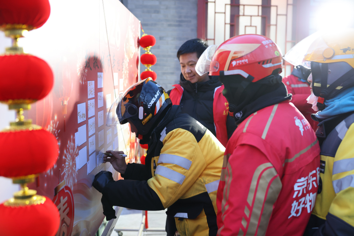南门驿站持续开展“为你加油”节日送温暖活动,联合燕园街道与美团党委,推出“暖冬守护,跨年同行——致敬城市奔跑者”主题活动。活动为外卖骑手准备了围巾、羽绒马甲等御寒物品,还在现场贴心提供姜糖茶驱寒。骑手们通过为北大师生书写新年祝福,即可领取对应物品,短短时间吸引了约280人参与。不少骑手感动地表示:“在北大真正感受到了尊重。”此外,驿站也通过外卖格口为师生准备了零食、冰箱贴等新年小礼,让温暖在校园内外双向流动。