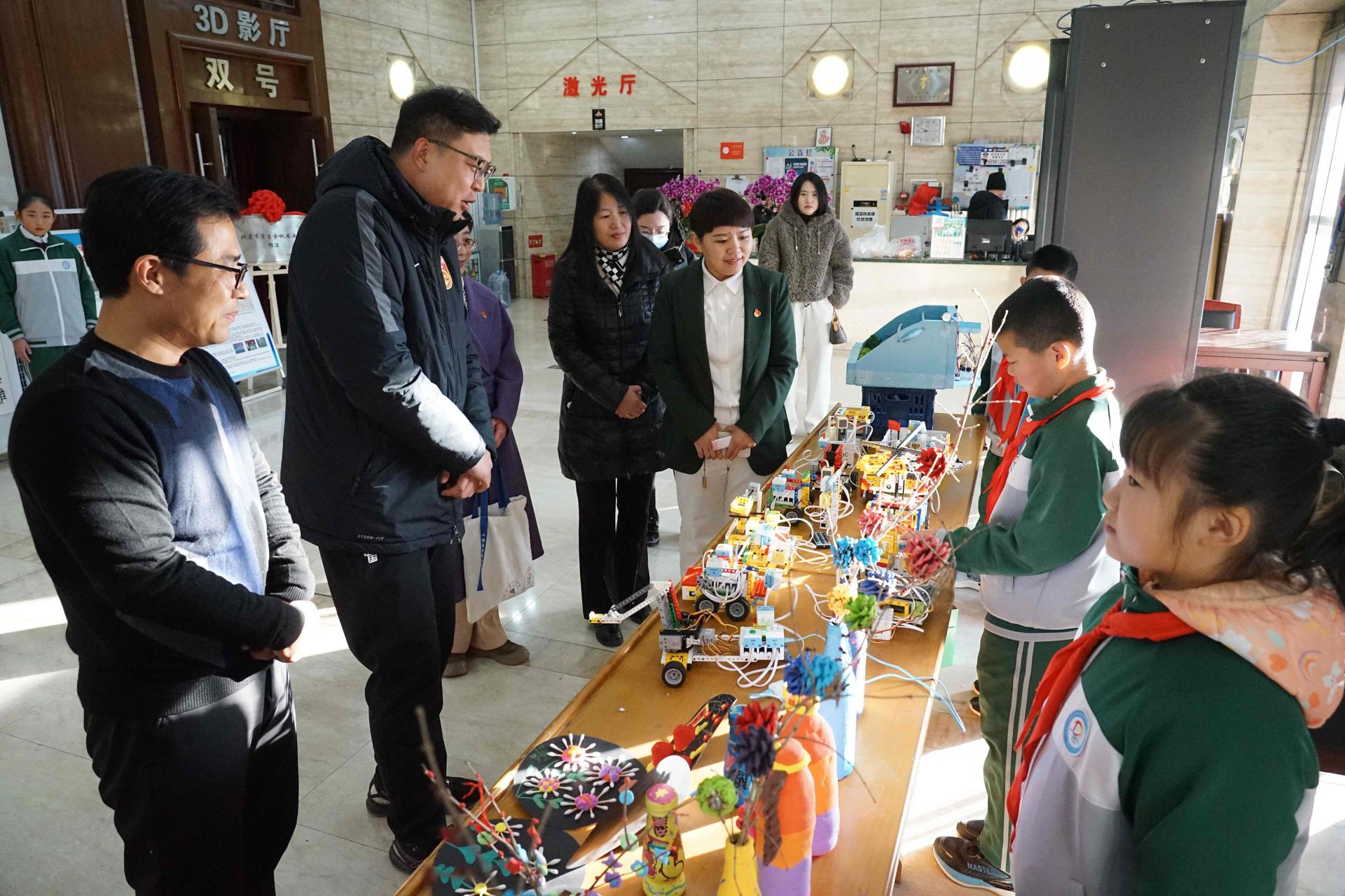 在静态展示区,书法、绘画、编程与非遗传习作品琳琅满目,吸引了与会嘉宾、家长纷纷驻足。孩子们扎实的功底与丰富的想象力,赢得了现场的一致称赞。书法展示区尤为热闹,大兴庄中心小学学生吴可介绍说:“我从一年级开始接触书法,到五年级已经能完成独立创作。除了每周的书法课,我每天中午都会在教室练习。书法不仅锻炼了我的意志,也提升了我的审美。”一旁指导的书法老师郭有志补充道:“学校的书法教育已形成完整教育体系,我们培养的不只是技能,更是心性的沉淀。学生的作品多次在全国获奖,有的还被艺术馆收藏。”