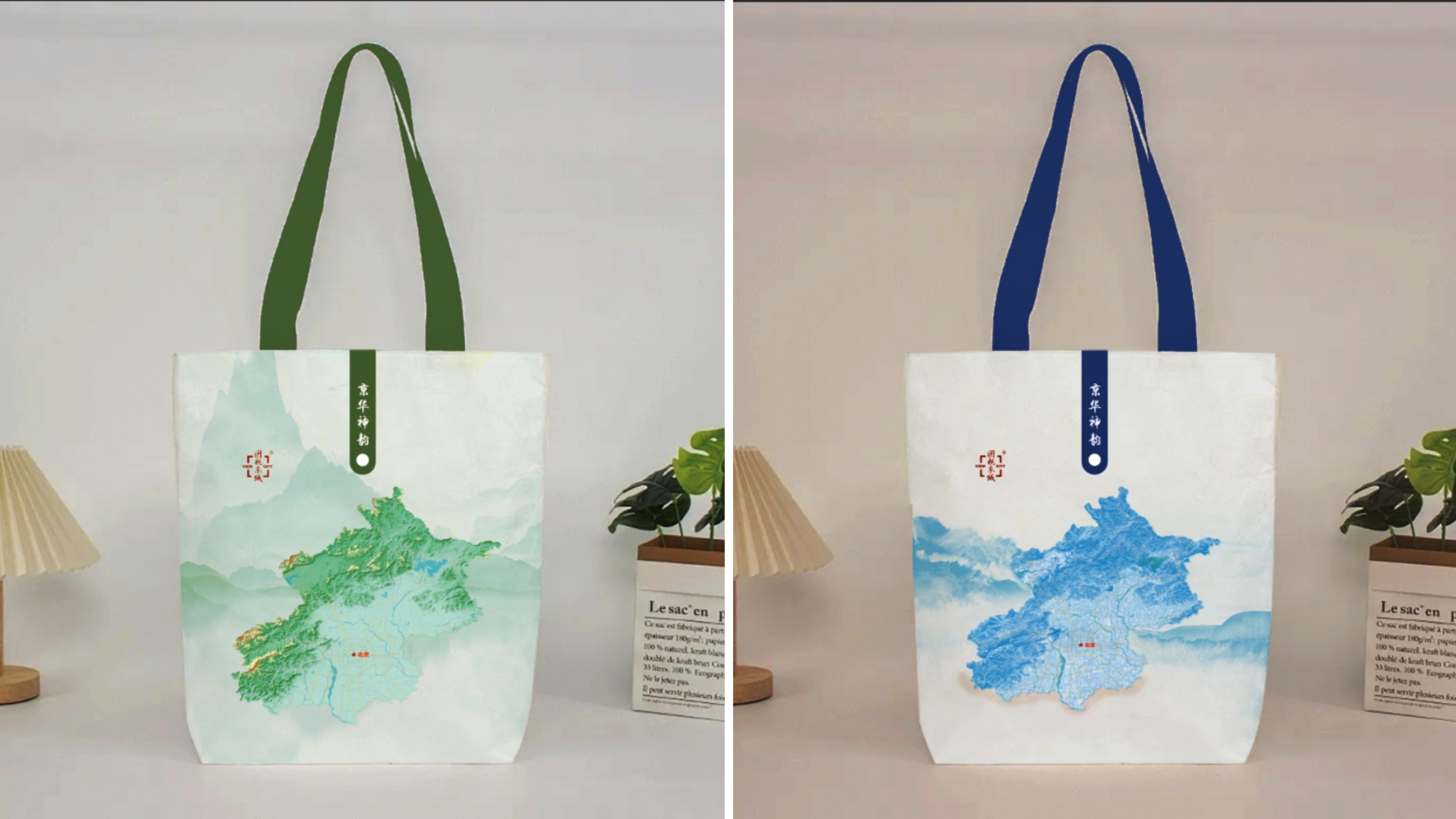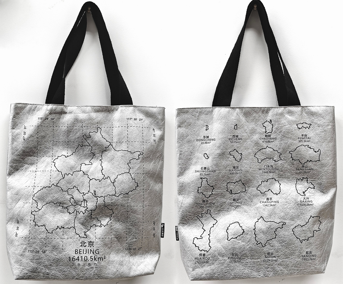 用中国画白描技法展示北京行政区划分名称等信息的手提袋