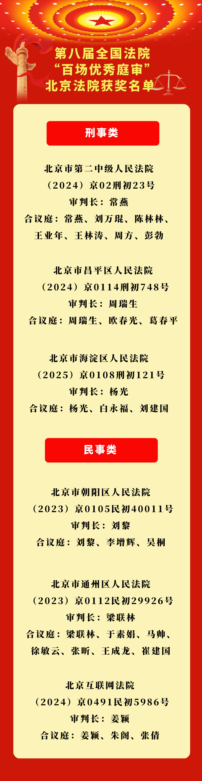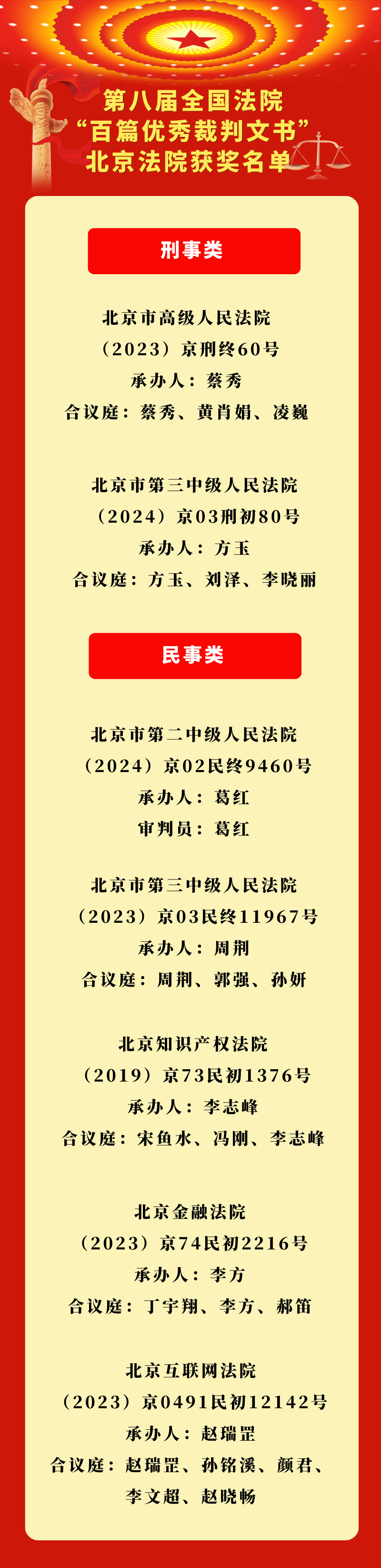 近日,最高人民法院对第八届全国法院“百篇优秀裁判文书”“百场优秀庭审”评选获奖结果进行通报。经过初评、复评、总评等各个阶段的层层筛选,北京法院推荐的裁判文书和庭审在全国各级法院推选的464篇裁判文书和331场庭审中脱颖而出,分别有7篇裁判文书和6场庭审获