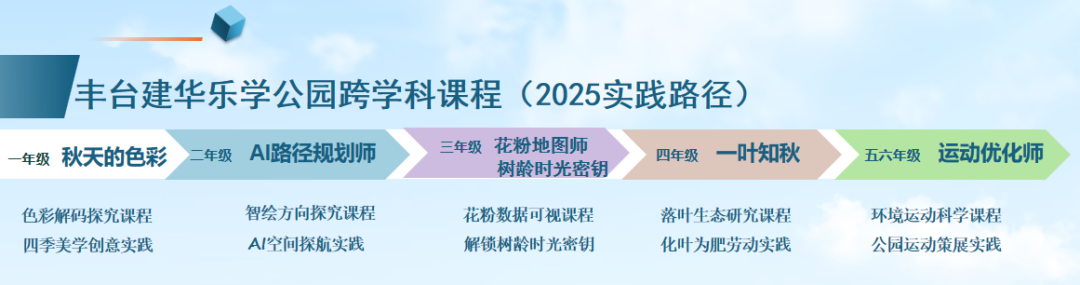丰台建华乐学公园项目跨学科综合课程纵深研究,整理各学段学生的真实兴趣与驱动性问题,系统构建1-6年级的跨学科课程图谱。这不仅是“以问题为起点”的教学探索,更是我校跨学科课程的一体化建构尝试,为课程的纵深与系统推进奠定了坚实基础。低年级重在感知与发现,中年级聚焦探究与分析,高年级则强调创造与担当。