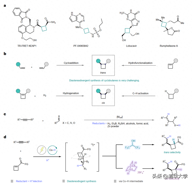 环丁烷结构广泛存在于多种天然产物与药物分子中,其相对构型(顺式cis或反式trans)对生物活性具有重要影响(图a)。然而,传统合成方法往往只能选择性地制备某一种立体异构体,难以实现从同一底物出发高效、可控地合成所有可能的异构体,开发通用性强的立体发散式合成策略仍极具挑战(图b)。