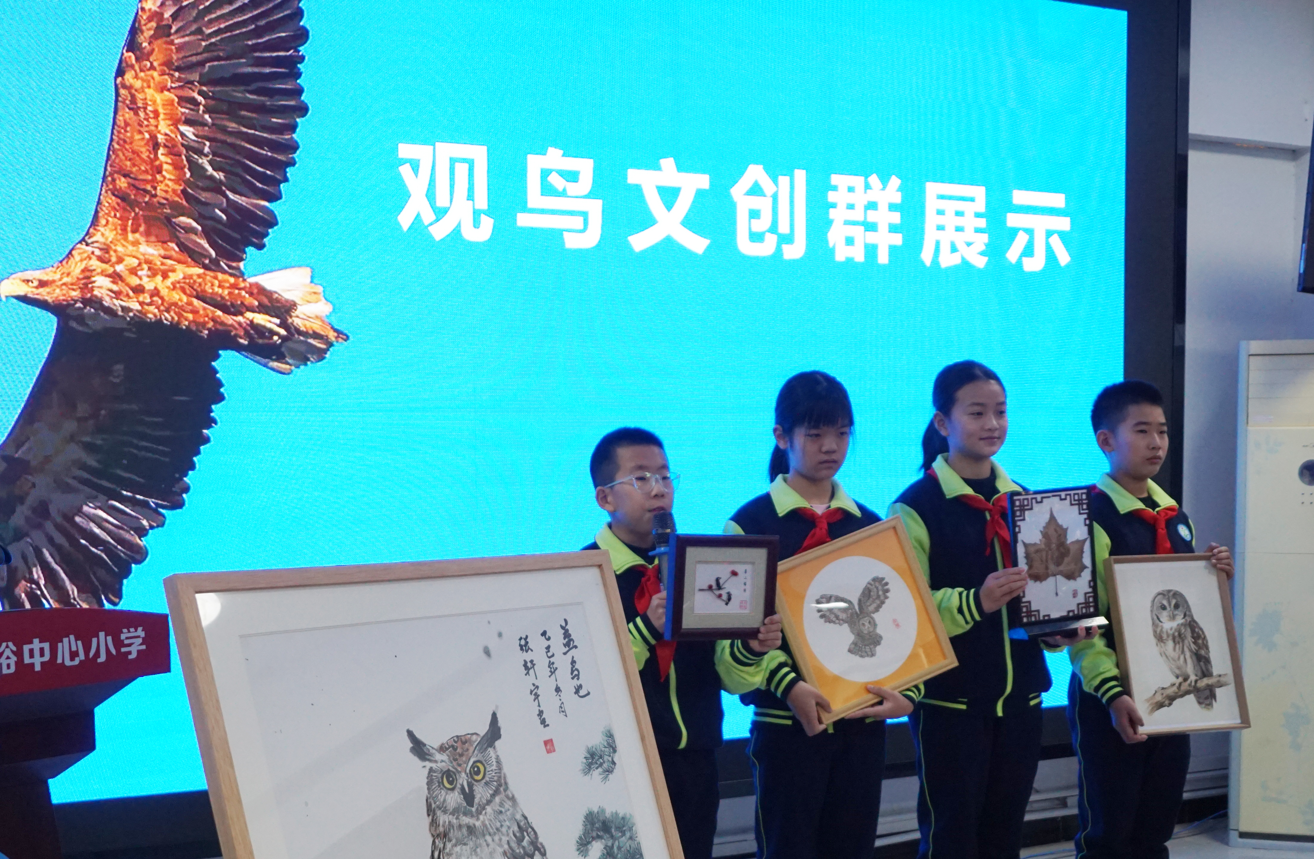 仪式上,黄松峪乡政府相关代表将团旗郑重授予学生。观鸟社团的团旗以猫头鹰形象为设计核心,象征着智慧与守护。学生们讲述了救助灰林鸮的感人故事,校内多个社团带来叶雕、豆塑、蛋皮画、国画、书法、AI动画创意作品,向观鸟社团的成立表示祝贺。