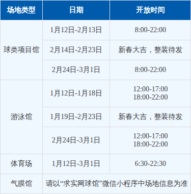 3.为提升服务质量,游泳馆将于1月19日至2月23日进行闭馆升级。期间,将对更衣室、淋浴间等区域的硬件设施进行全面维护与深度清洁。