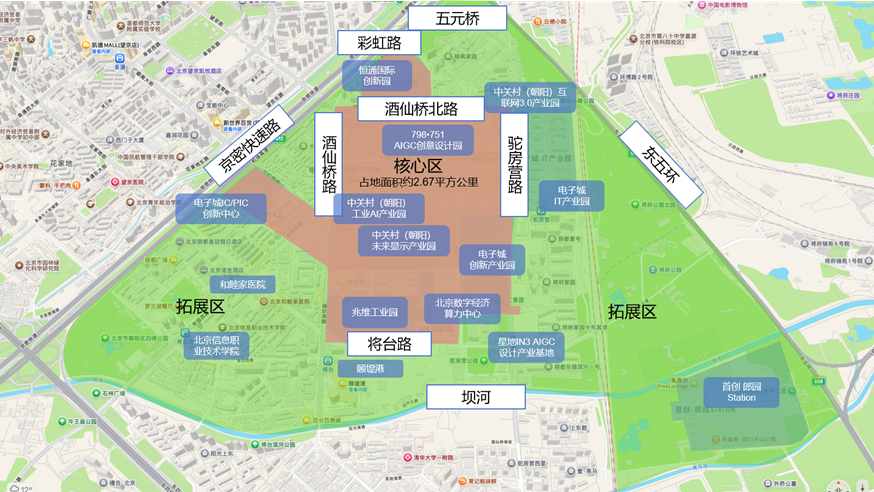 光智空间东至东五环,南至坝河,西至京密快速,北至五元桥,分为核心区和拓展区,其中核心区,酒仙桥科创活跃度高、竞争力足、影响力大的园区企业集聚于此,拓展区则辐射整个酒仙桥北部片区。光智空间拟建设原始创新区、核心算力支撑区、技术研发与应用验证区、技术研发拓展区、场景互动体验区、产教融合实验区、创新总部集聚区、精品内容生产区、商务服务区和人才生活保障区等十大功能组团,形成要素完善、功能健全、相互协同的空间布局。