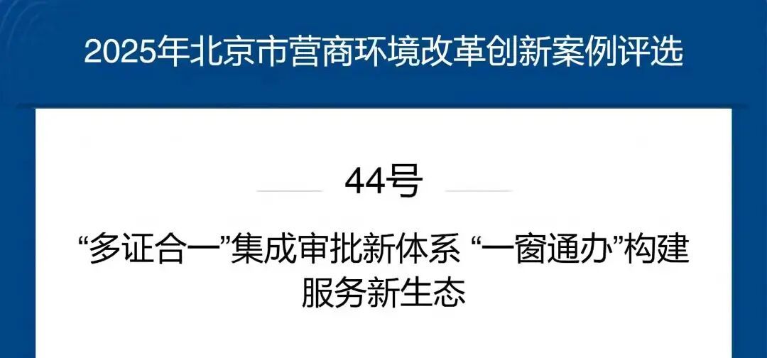 区级44号案例简介:“多证合一”集成审批新体系 “一窗通办”构建服务新生态(顺义区生态环境局、丰台区)。顺义区以重点企业项目为试点,精准实施环评、排污许可、辐射安全许可“三证合一”审批新模式;丰台区在全面落实市级“两证合一”政策基础上,率先在全行业推行“多证合一”改革。两地改革均聚焦“减环节、减材料、减时限、提效能”的核心目标,旨在通过系统性流程再造与协同机制创新,为企业发展清障提速,以“生态绿”护航“产业红”,为全市生态环境领域行政审批制度改革提供了生动的区域实践。