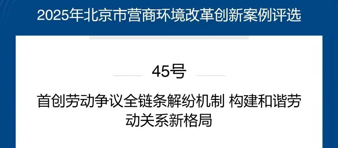 区级45号案例简介:首创劳动争议全链条解纷机制 构建和谐劳动关系新格局(顺义区人力社保局、顺义区人民法院)。顺义区坚持问题导向与源头治理,推动司法、行政、社会力量深度融合,创新构建了覆盖“预防、调解、仲裁、诉讼”全链条的一站式解纷体系,并针对“小微”争议创设速调快审专门通道,为区域高质量发展提供了坚实的法治保障。