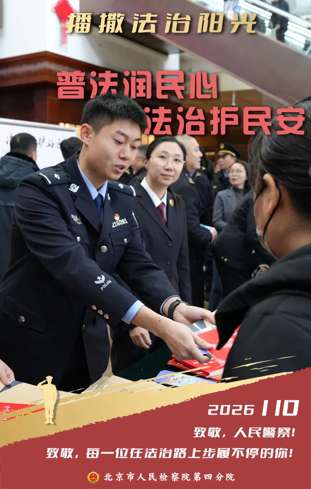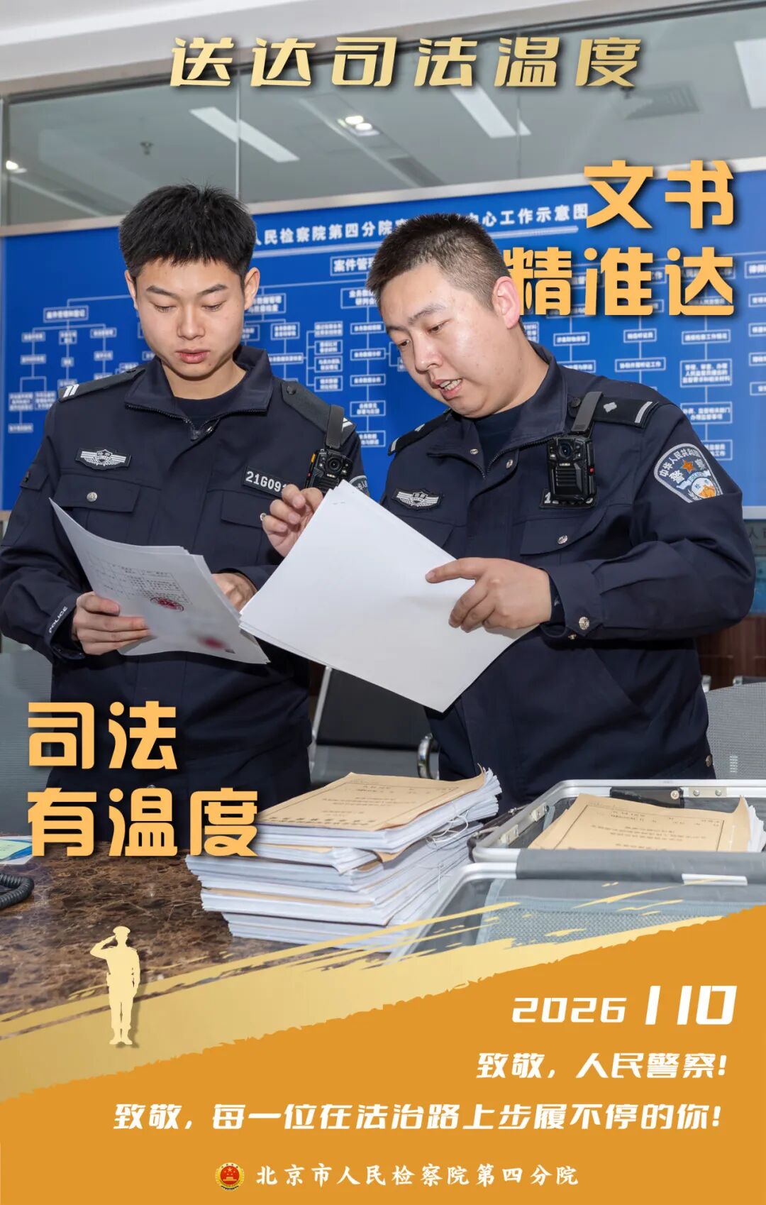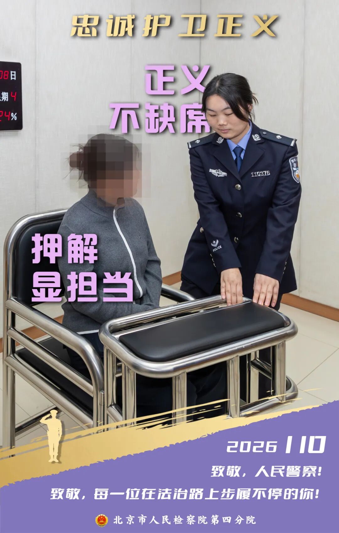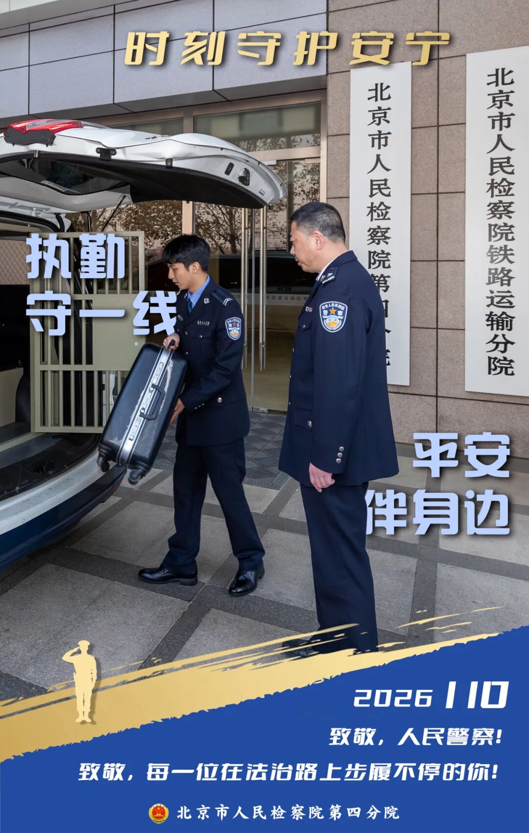 2026年1月10日是第六个“中国人民警察节”,我们向每一位在平凡岗位上默默奉献的人民警察致以最崇高的敬意!在北京市检察机关,有这样一支司法警察队伍:他们扎根在检察履职一线,以忠诚专业守护司法公正与温度。让我们透过四组海报,走进检察机关,看看司法警察的日常,感受检察蓝中的警徽荣耀。