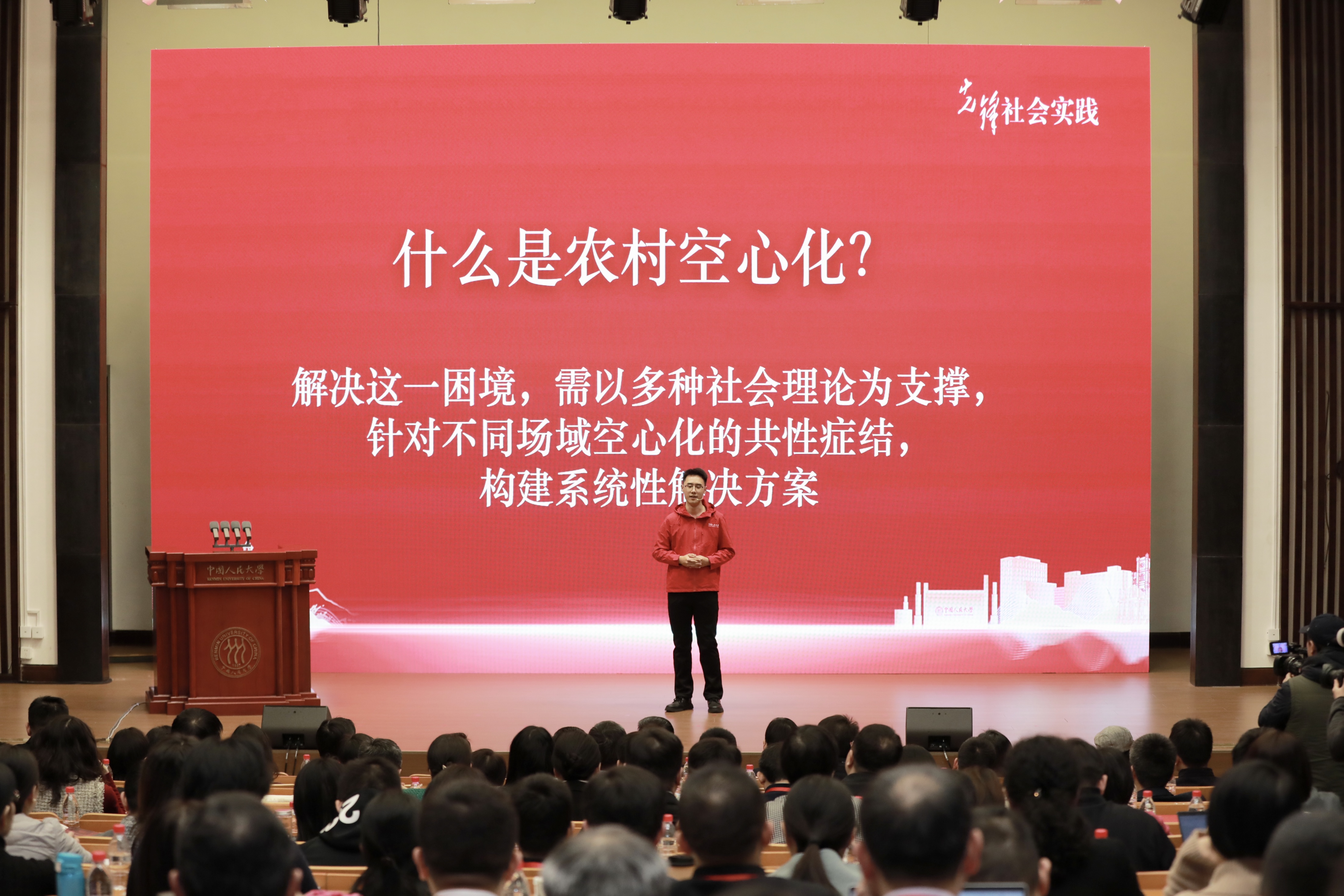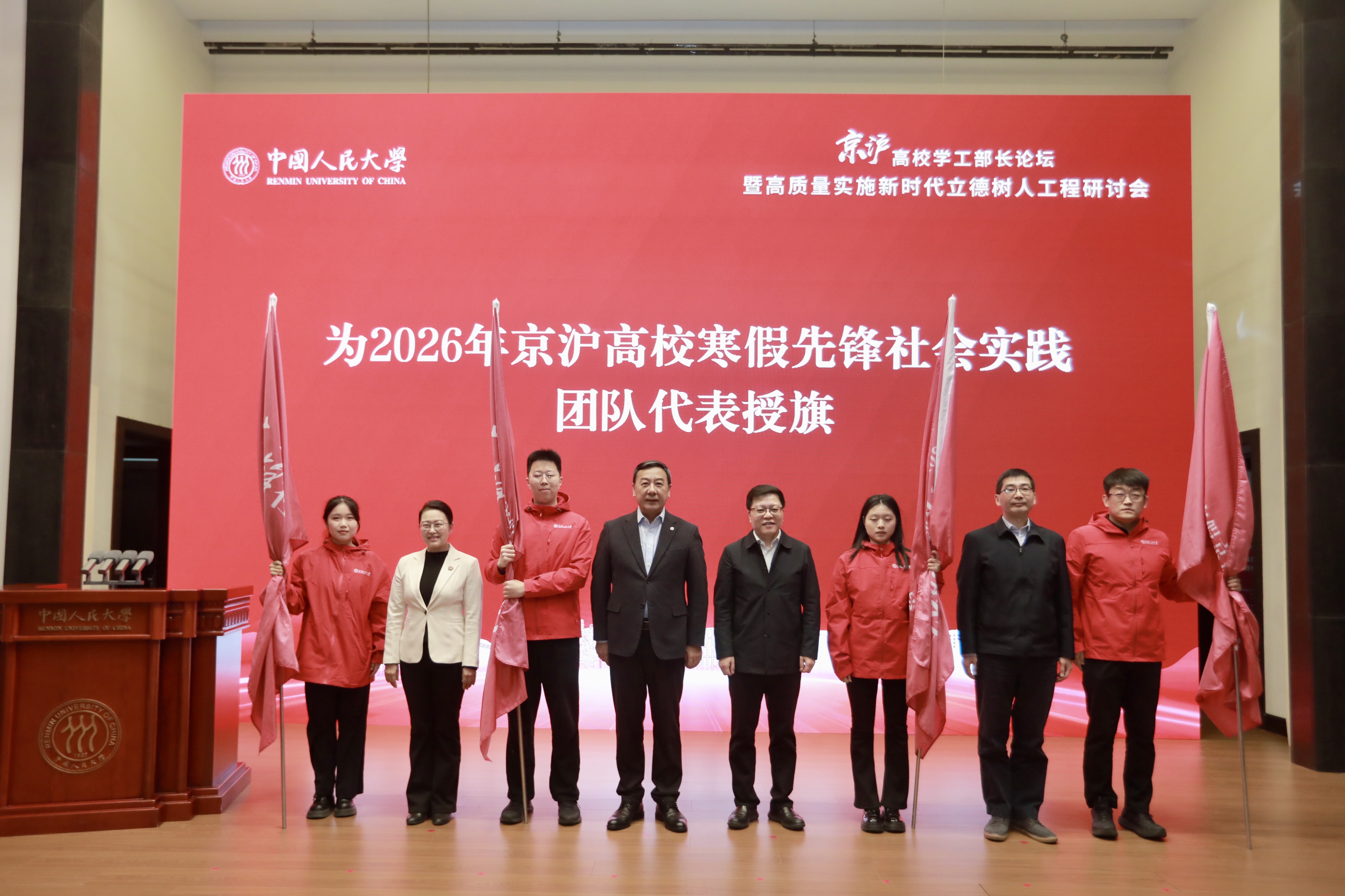当天,来自北京大学、清华大学、上海交通大学、复旦大学等8所京沪高校的学工部长分别围绕实践育人大课堂建设、网络育人新课堂建设、行业领域育人共同体建设、思政工作队伍建设等主题进行了交流分享。中国人民大学的5名学生代表通过讲述故事,介绍并发布《青春践初心》《从抗日烽火走来 向民族复兴奋进——抗战胜利80周年纪念活动中国人民大学志愿者实录》等2025年先锋社会实践体系育人成果。与会嘉宾还为2026年寒假京沪高校先锋社会实践团队代表进行了授旗。