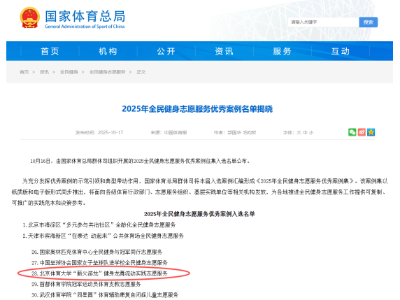 竞技成绩之外,学校全民健身与群众体育工作亦蓬勃开展。在总局群体司指导下,学校持续开展“奋进新征程 运动促健康”全民健身志愿服务系列活动,组织奥运冠军、专业教练员、运动员、科研人员等深入校园、社区、乡村和企事业单位,全年服务超万人次。2021至2025年间,学校共有3个集体、4名教师荣获全国群众体育先进表彰,“薪火游龙”健身龙舞志愿服务项目入选2025年全国全民健身志愿服务优秀案例。