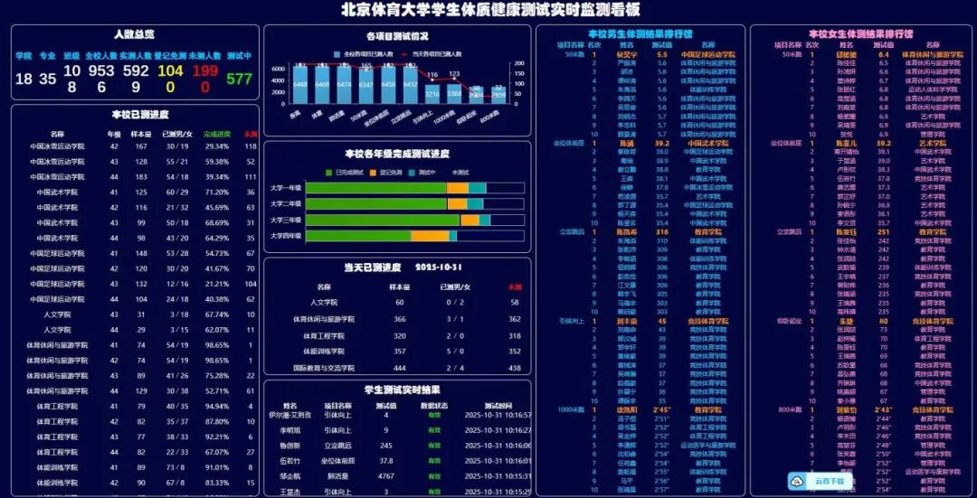 学校牢固树立“健康第一”的教育理念,首次实现全校学生体质健康测试全覆盖,并引入实时数据监测与分析系统。通过测试数据即时采集、结果动态反馈、多维度统计与可视化呈现,实现了对学生体质状况的全程跟踪。各单项成绩排行榜的发布,在学生中引发广泛关注与讨论,有效激发了学生参与锻炼、追求健康的主动性和竞争意识。体质测试不仅是对学生健康状态的系统评估,更是学校深化“体测育人”模式、完善健康干预与激励长效机制的重要举措,为打造全国高校“以体育人”示范工程奠定了坚实基础。