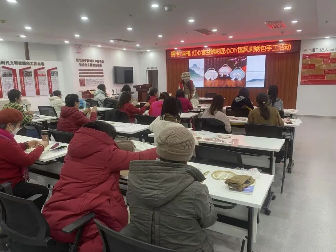 12月12日,30名辖区企业女职工在党群服务中心活动室,共同体验指尖上的传统文化——国风刺绣包手工。专业老师现场讲解刺绣技法与配色要领,帮助大家快速掌握基础针法,为动手创作做好准备。
