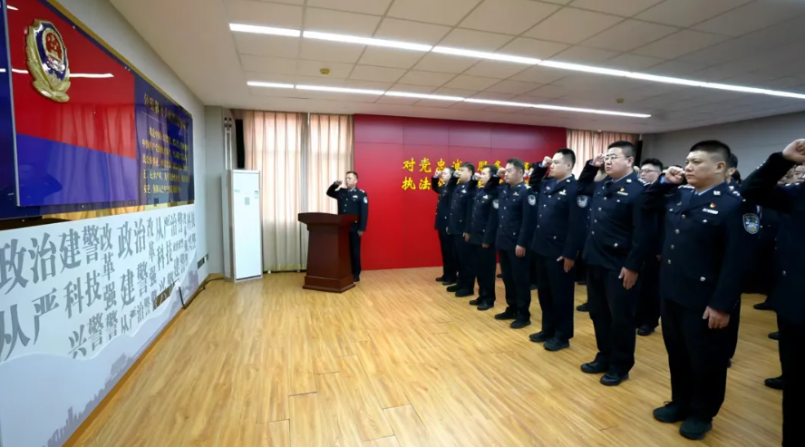 仪式现场,红色背景墙上“对党忠诚、服务人民、执法公正、纪律严明”的标语格外醒目。全体民警警容严整,神情肃穆,在警旗前高举右拳,誓言声响彻全场。字字千钧的承诺,是对崇高使命的郑重宣告,更是守护平安的坚定决心。