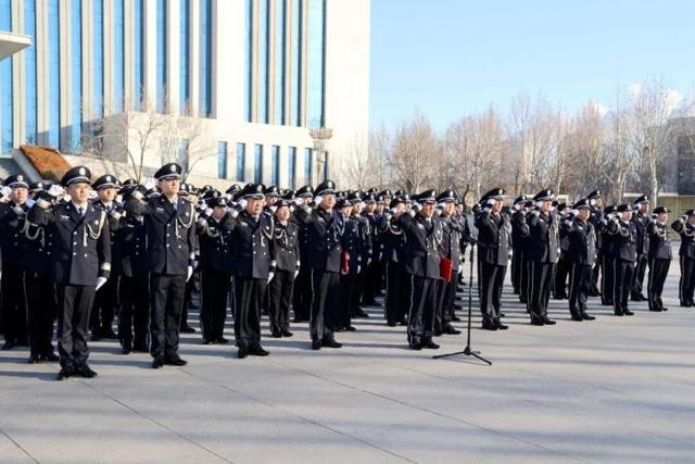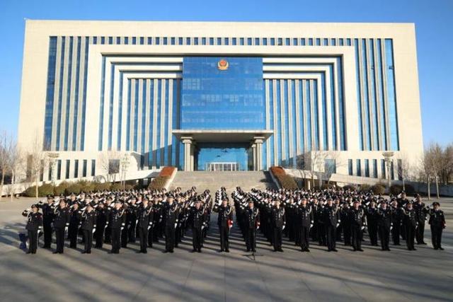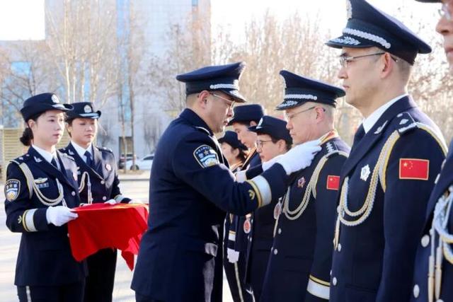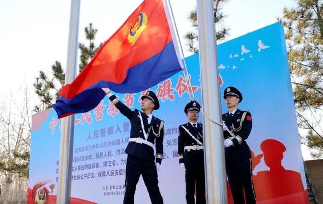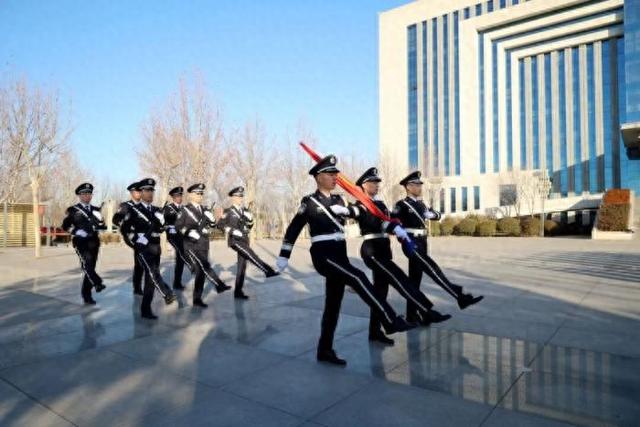 “全体敬礼!”随着一声令下,警旗护卫队迈着铿锵有力的步伐,护卫着警旗走向升旗台。鲜艳的警旗冉冉升起,全体干警身着警礼服、昂首挺胸,向警旗庄严敬礼。