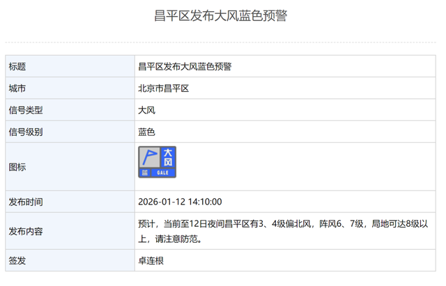 2026年1月12日14时10分,昌平区发布大风蓝色预警:预计,当前至12日夜间昌平区有3、4级偏北风,阵风6、7级,局地可达8级以上,请注意防范。