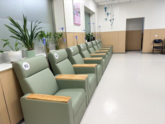 推开日间化疗病房的大门,映入眼帘的不是一片肃穆的白色,而是明亮、整洁且充满温度的空间。宽敞的治疗区内,一张张舒适的沙发椅整齐排列,保证了患者治疗时的体位舒适。温暖的灯光、洁净的环境,以及墙上点缀的绿植和温馨提示,共同营造出安静、舒心的氛围,安抚患者可能存在的紧张与不安。