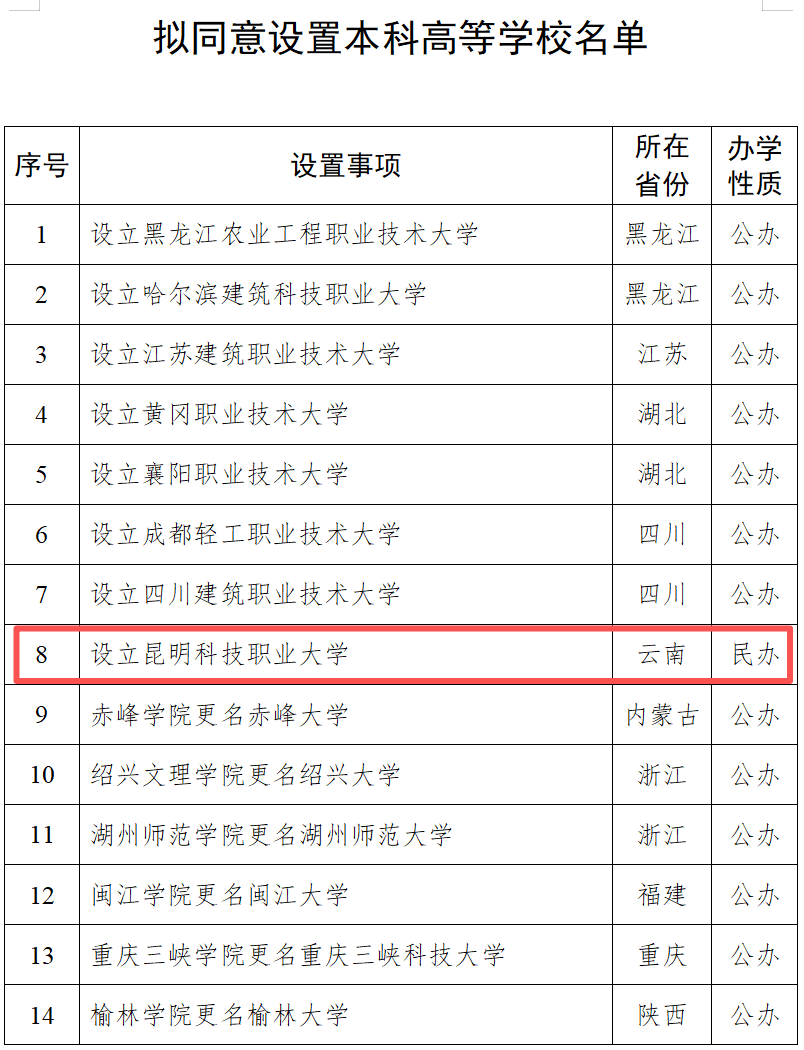 1月12日,教育部发布关于拟同意设置本科高等学校的公示,其中云南省拟设立昆明科技职业大学。