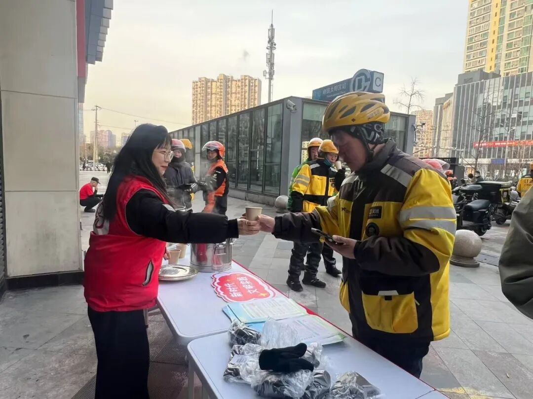 活动现场,工作人员早已将精心准备的慰问物资摆放整齐。一条条厚实的围脖、一副副保暖的手套,承载着对小哥群体的深切关怀。刚完成配送的小哥们陆续来到现场,工作人员热情上前,将保暖物资和一杯杯热气腾腾的热水,送到他们手中,帮他们驱散户外奔波带来的寒意。“天气这么冷,收到围脖和手套太及时了,还有热水暖手,心里特别暖和!”刚送完一单外卖的小哥接过物资说道。