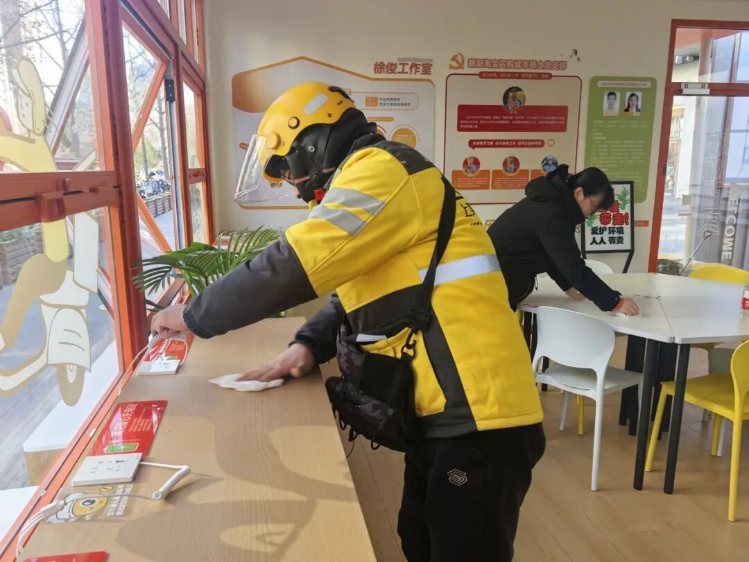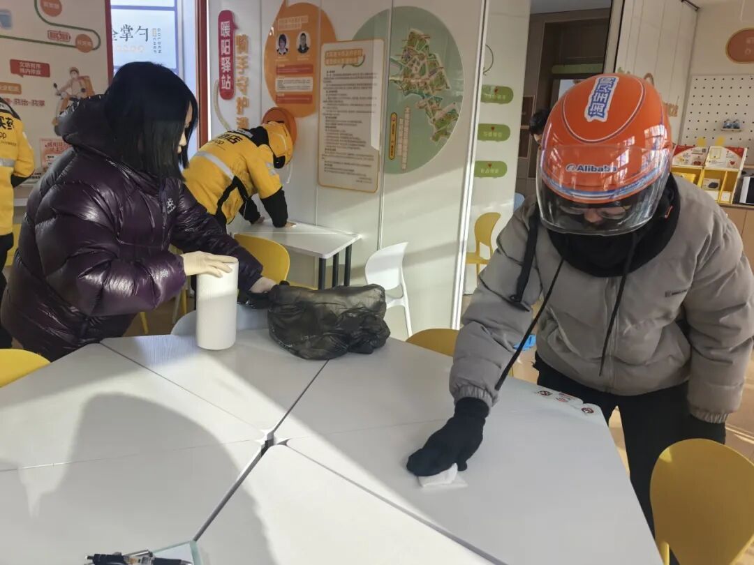 活动中,小哥们手持抹布、垃圾夹等工具,对暖阳驿站公共区域的卫生死角、边角缝隙进行重点清理。经过众人的共同努力,社区周边环境焕然一新,整洁有序的环境让居民眼前一亮。