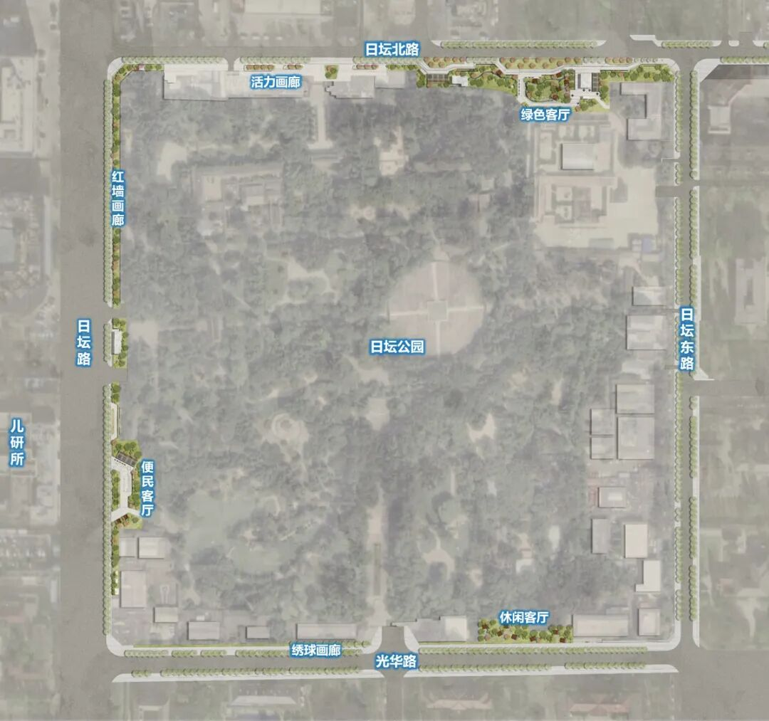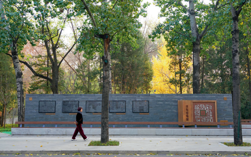 沿街设置了日坛老照片文化墙,展示日坛片区的历史老照片,唤起城市历史记忆;日坛老地图文化墙,展示日坛片区的发展与变迁,地图文化小品展示日坛片区的古今对比,呼应日坛公园深厚的文化底蕴。