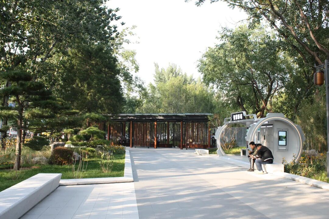 除了打造休闲、娱乐空间,日坛公园西门外的一块城市绿地,还被打造成了一个智慧驿站。首都儿科研究所(简称儿研所)是北京著名的儿童医院,周边人员密集,很多挂号后无处落脚的家长和孩子只能无奈站在街对面的绿地内等候就医。公园让出资源,将原本封闭的绿地改造为儿研所对面的就医休息空间,设置零食售卖驿站、医院挂号二维码、旅行箱存放柜、避雨廊架、休息设施、智慧监控等多项便民设施,增强花园城市建设的细节与温度。