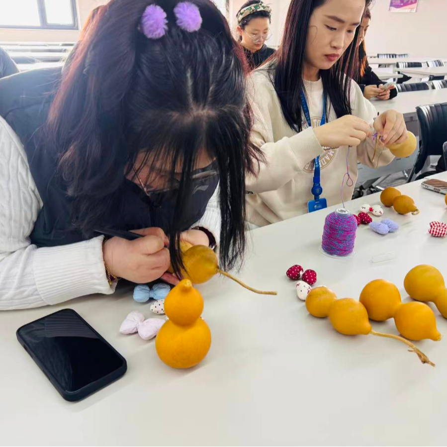 此次活动,特邀请李堡村葫芦烙画守艺人孙老师进行现场授课,从历史渊源、工具使用与作品鉴赏三个方面,系统讲解了葫芦烙画的艺术特点。实践环节中,大家手持葫芦,在孙老师的细致指导下,以烙铁代笔、以温度作墨,在葫芦表面勾勒点染。