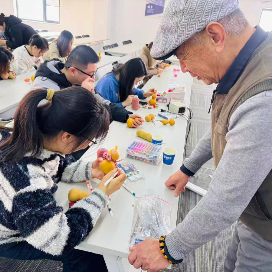 孙老师手把手指导青年们握笔力度、控温技巧,从简单的线条勾勒到图案细节填充,耐心解答大家的疑问。青年们认真专注,手持烙笔在葫芦表面小心翼翼地创作,融入自己的创意与情感,原本素净的葫芦表面随之浮现出疏密有致、深浅相宜的生动画面,青年们 “火笔生花”,让葫芦烙画以更鲜活的姿态走进青年人视野。