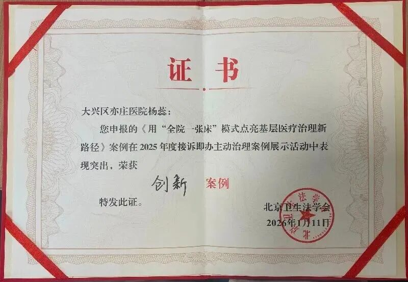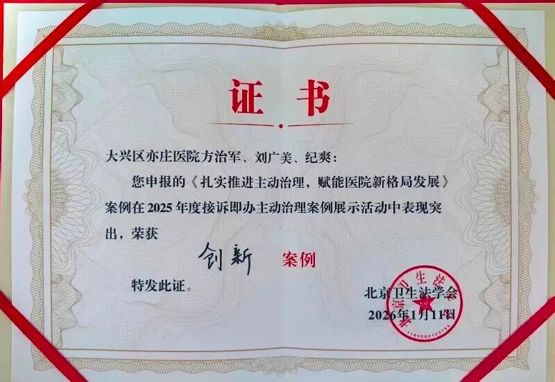 1月11日,由中国研究型医院学会医药法律专业委员会与北京卫生法学会联合主办的2025年度医院主动治理案例展示活动隆重召开,北京市大兴区亦庄医院报送的《扎实推进主动治理,赋能医院新格局发展》和《用“全院一张床”模式点亮基层治理新路径》两项实践案例,从全国众多参赛成果中脱颖而出,荣获“创新案例奖”,这标志着亦庄医院在探索主动治理模式创新与基层医疗质量提升方面取得的成效获得了权威认可。
