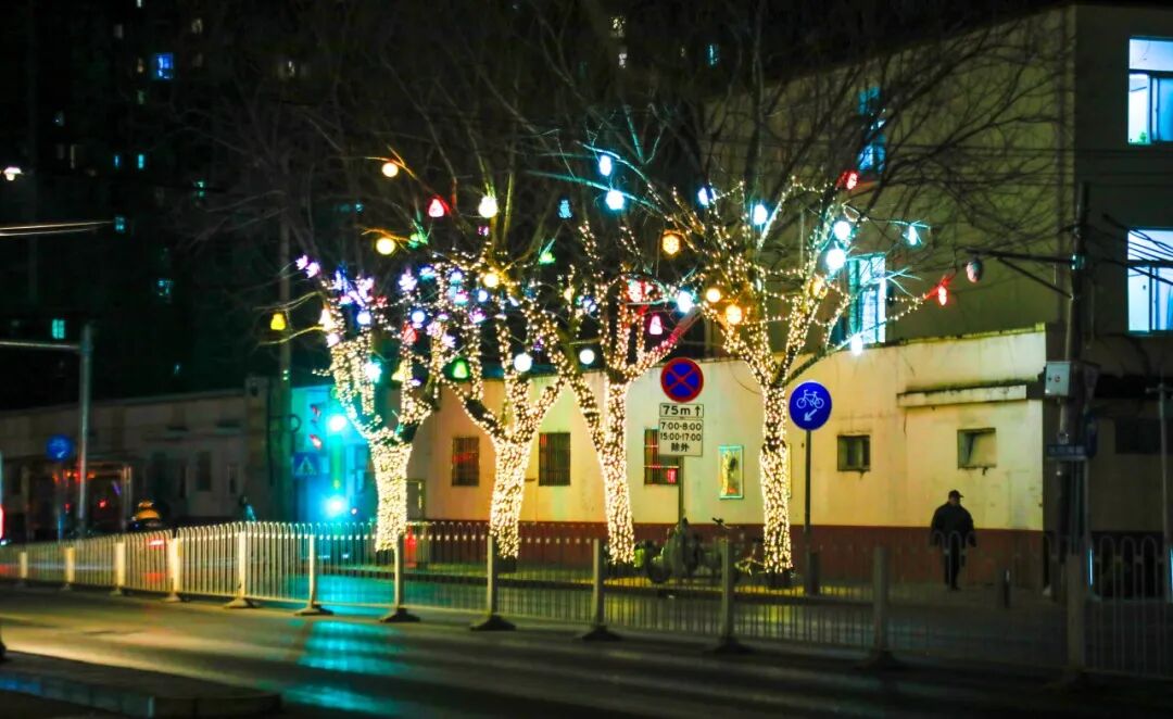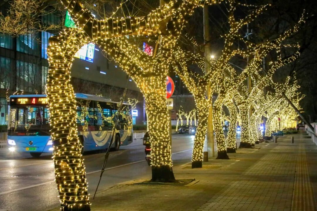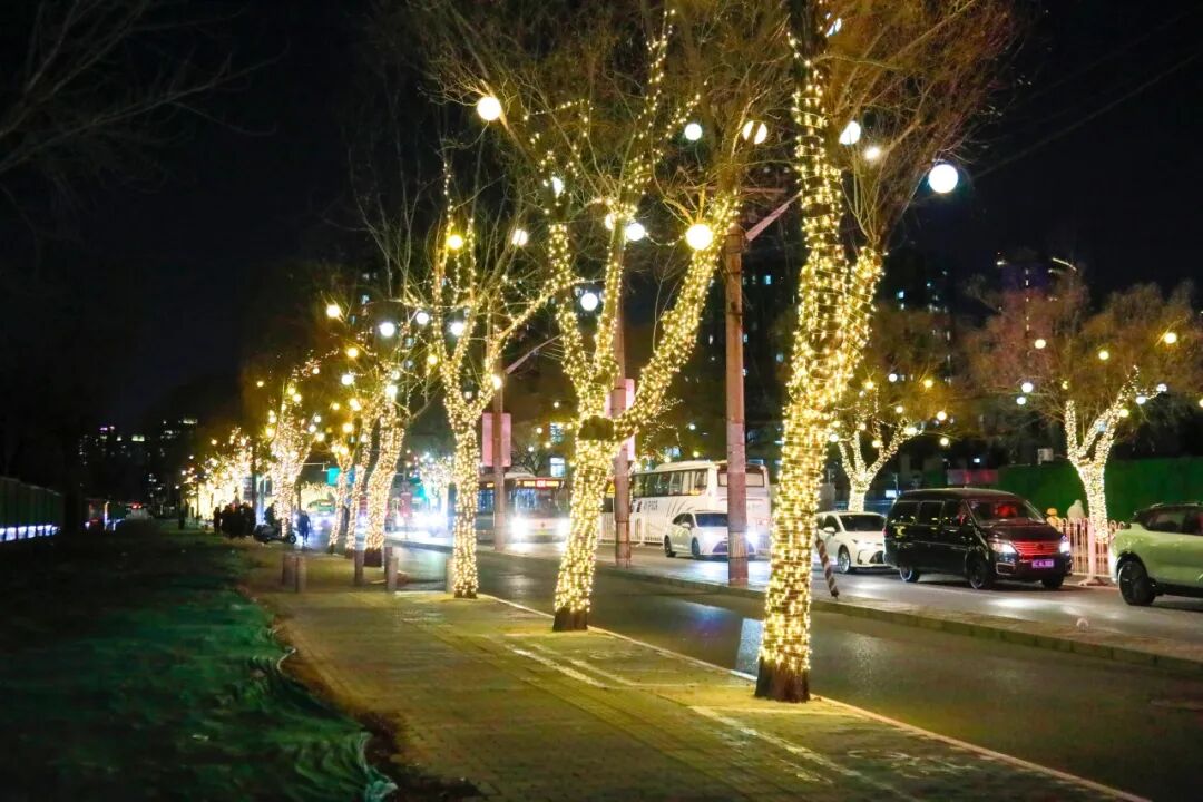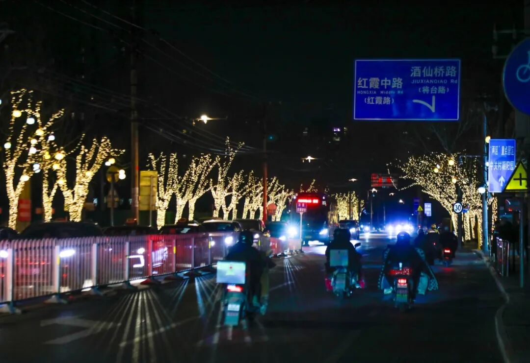 夜风吹过酒仙桥路,华灯初上,流光溢彩的暖光裹着生活的烟火气漫过街巷,每一缕灯串的时隐时现,都在诉说着寻常日子的期盼。枝桠裹满暖光,像把揉碎的星子缠在梢头,照亮了老街坊回家的路,也映亮了新居窗明几净的模样。