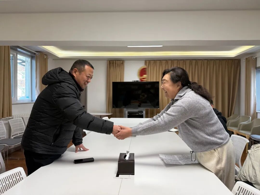 随着身体逐渐康复,王女士始终忘不了那位在她最无助时给予帮助的陌生人。她凭着记忆中的模样,向邻里、社区多方打听,经人多番询问,才得知救助自己的是邹积华。于是,她带着锦旗和由衷地感谢,专程来到新村街道,向邹积华当面道谢,“您的爱心之举真是救了我一命啊!今天我和我的家人专程来向您表达深深的感谢,您高尚的品质值得我们学习。”王女士紧握着邹科长的手,情绪十分激动。