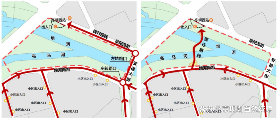 朝阳分局一方面对12号线东坝西站C口开展实地调研,全面掌握站点周边非机动车停放空间不足、摆放无序,慢行接驳服务能力较弱 ,东坝南区与西区交通联系不便,南区居民前往东坝西站乘坐地铁需长距离绕行等现状问题。另一方面研判交通需求,梳理区域骑行数据,识别市民骑行步行路线偏好与高峰时段特征,明确“轨道接驳优先、兼顾区域慢行通行”的功能定位,为桥梁设计提供数据支撑。此外,广泛开展公众意见征询,收集市民对桥梁出入口便利性、景观协调性等方面的建议,确保方案契合实际使用需求与城市风貌。同时,结合区域慢行交通痛点,以“补全慢行网络、强化通勤接驳”为导向,以连接轨道站点与跨河区域为目标,明确慢行接驳桥在区域交通网络中的角色,进一步完善“轨道+慢行”立体通勤体系。
